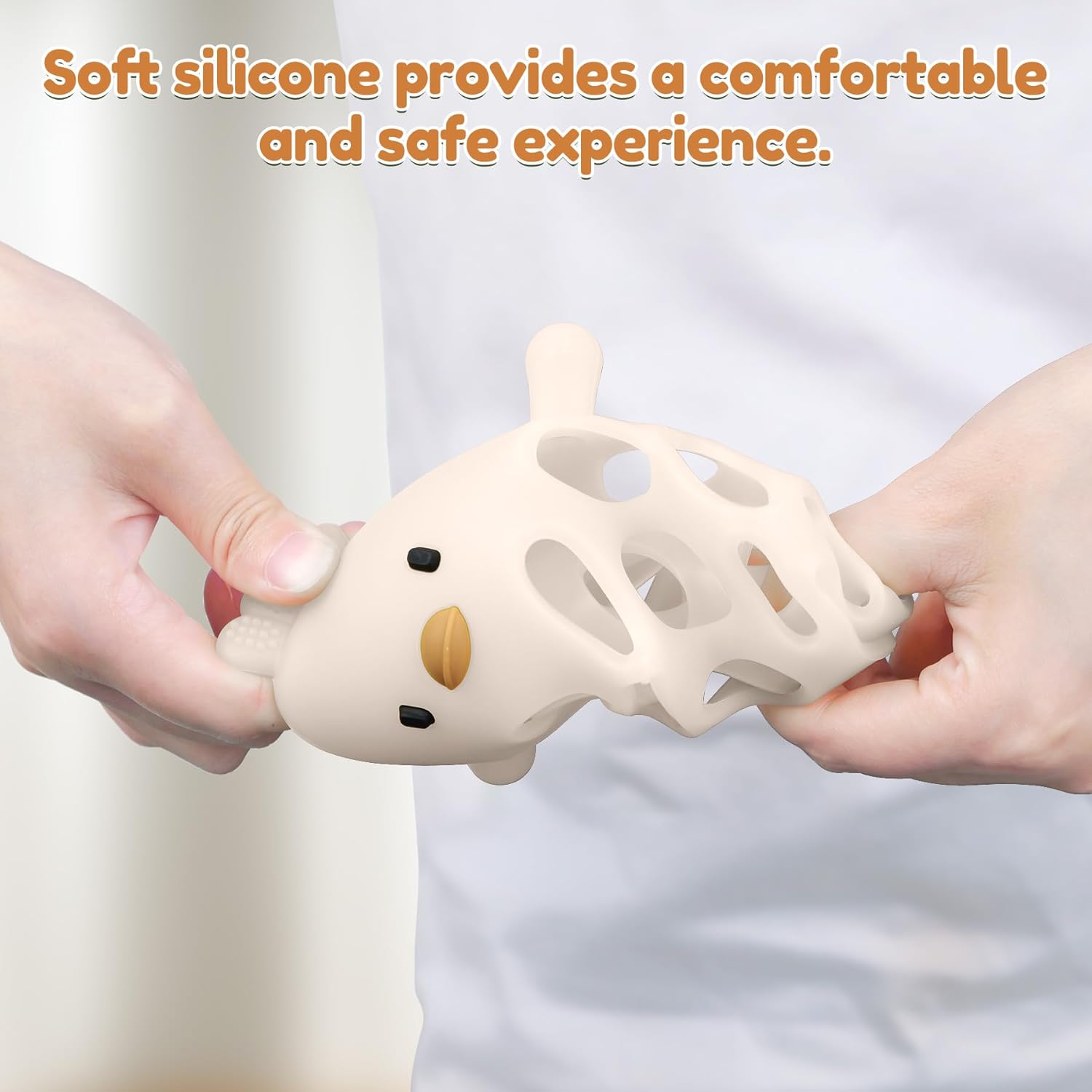 Mon fils est tombé amoureux de se jouer il ne le lâche pas de la journée. Super souple avec des trou permet une bonne prise en main et une superbe boule à l intérieur qui fait un petit bruit. Silicone se nettoie facilement.