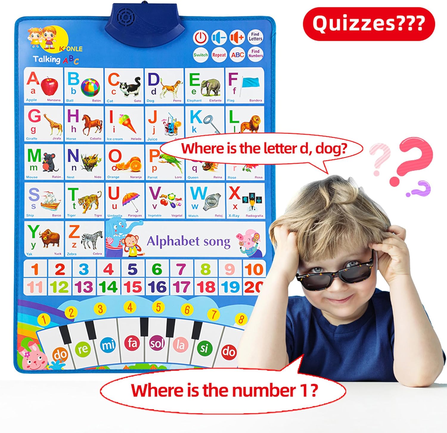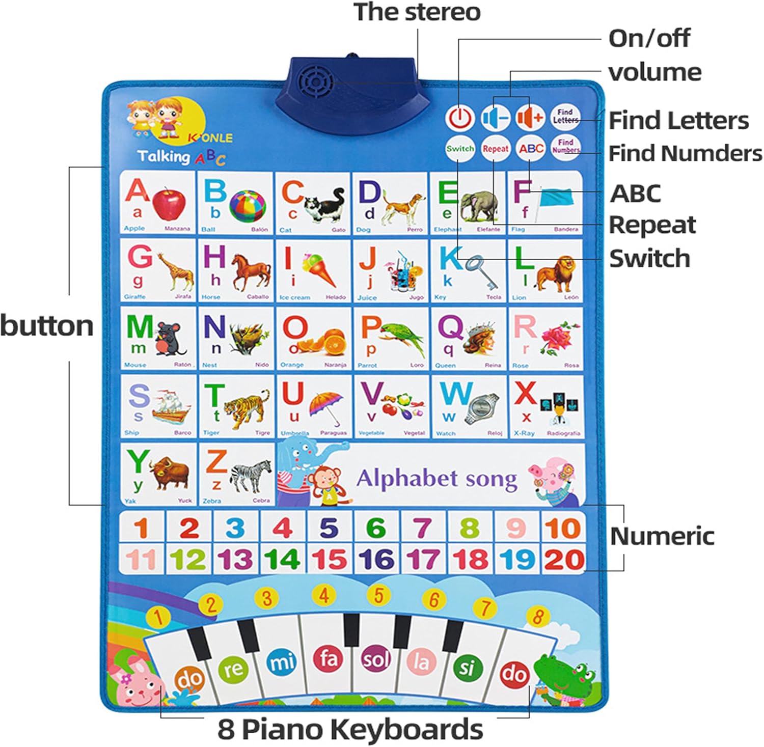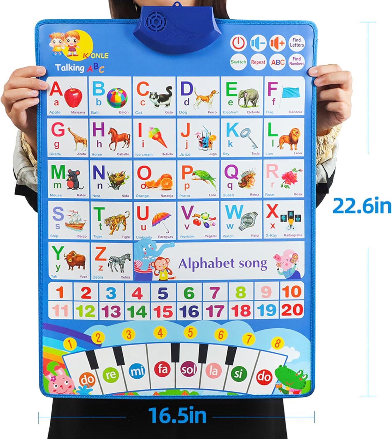 Cette affiche interactive permet de basculer facilement entre l’anglais et l’espagnol en appuyant simplement sur un bouton. Une fonctionnalité idéale pour initier les enfants au bilinguisme dès leur plus jeune âge. Ils pourront apprendre les chiffres de 1 à 20, les lettres de A à Z, ainsi que des mots du quotidien, des noms d’animaux et de fruits. Une façon amusante et intuitive d’élargir leur vocabulaire tout en développant leurs compétences linguistiques précoces.