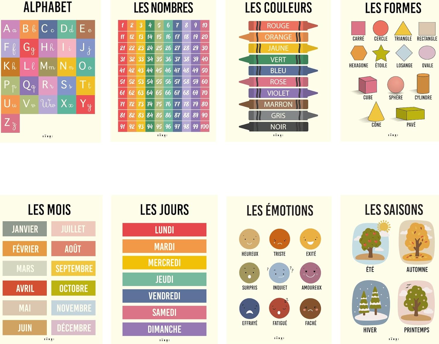 Offrez à votre enfant un lot de 8 affiches éducatives Montessori colorées et ludiques pour apprendre l’alphabet, les chiffres, les formes et bien plus tout en s’amusant.