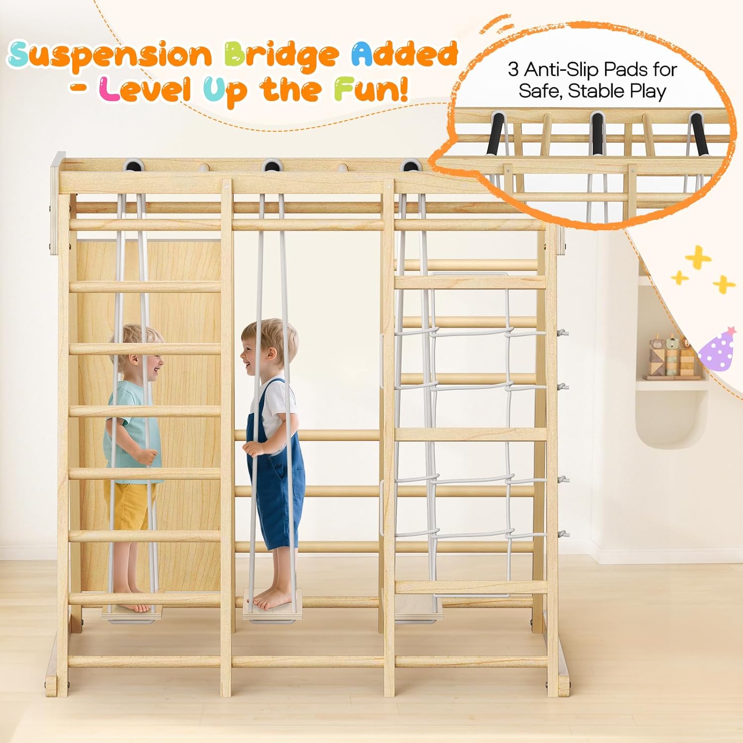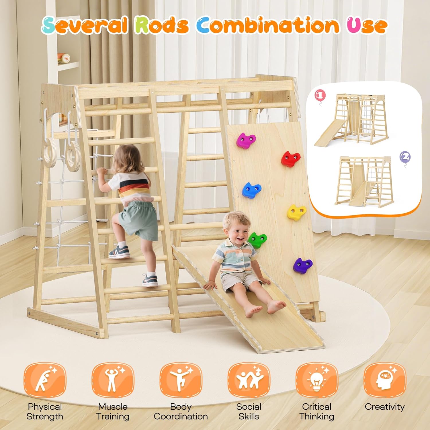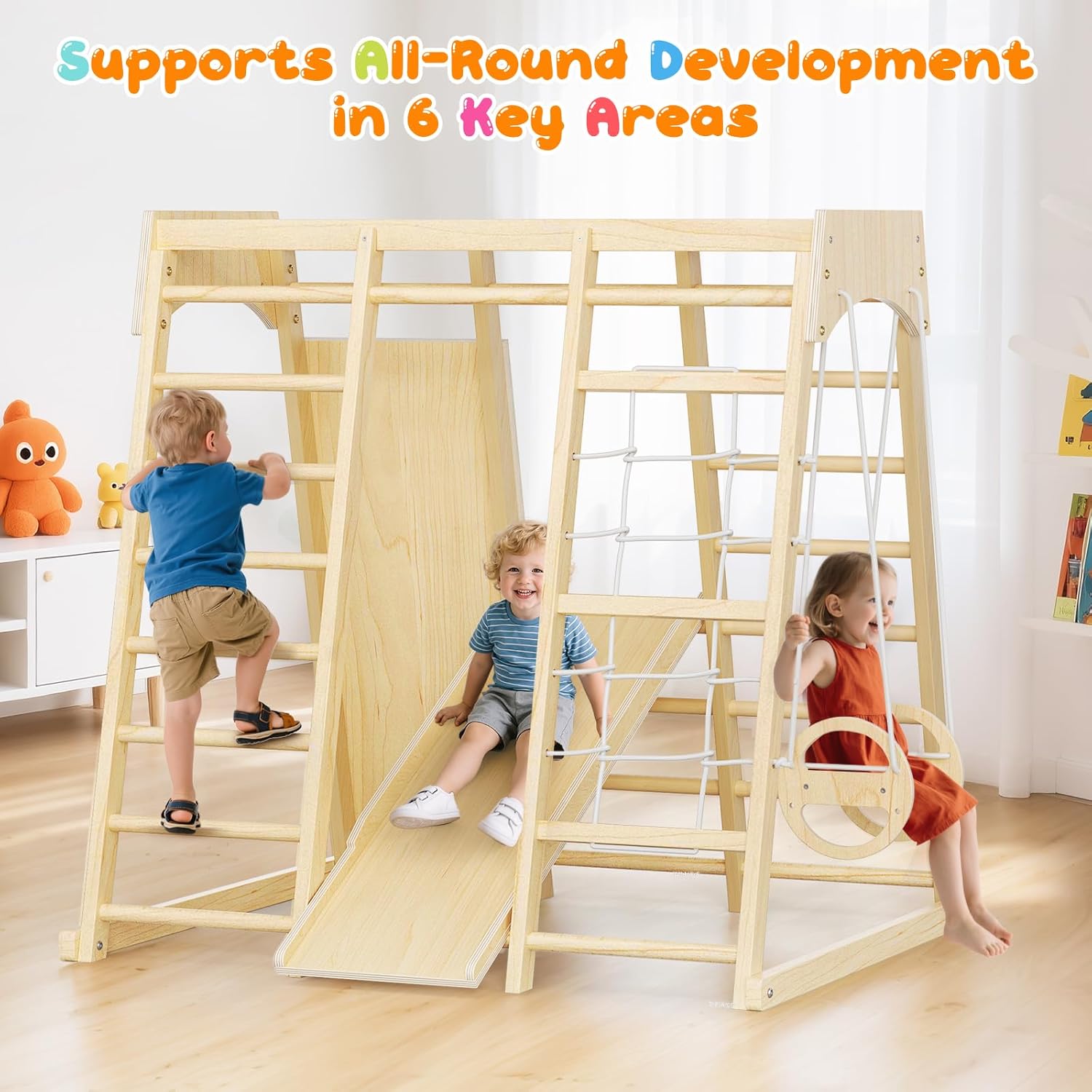 Conçue pour les enfants âgés de 1 à 6 ans, cette aire de jeux Montessori est le cadeau parfait pour toutes les occasions. Que ce soit pour un anniversaire, une fête ou simplement pour rendre les journées pluvieuses plus joyeuses, ce module d’intérieur est une solution idéale. Pas besoin d’espace extérieur : il s’intègre facilement dans n’importe quelle pièce de la maison.