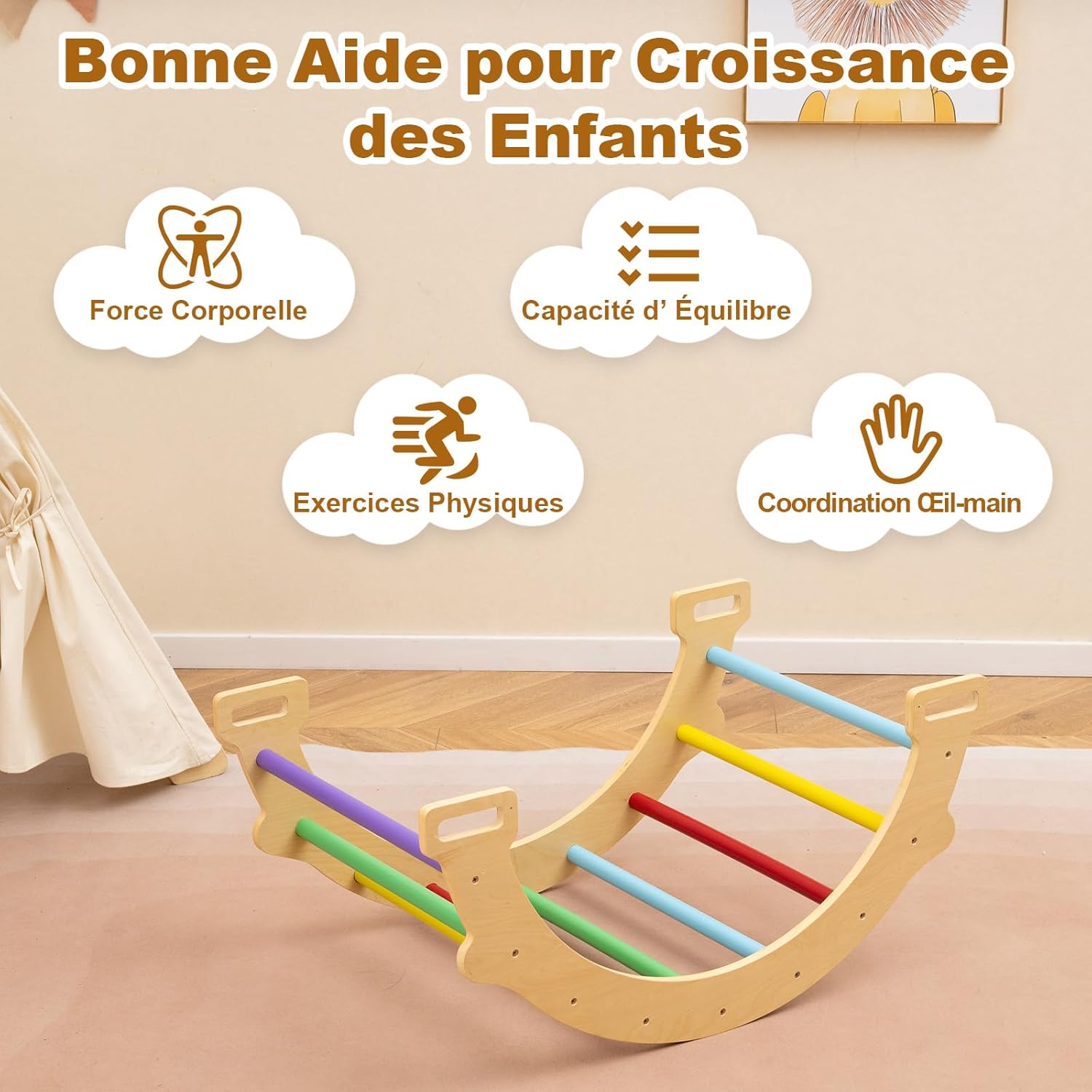 Découvrez l’arche d’escalade 2-en-1 Montessori en bois de hêtre, un jouet évolutif qui passe d’échelle d’escalade à bascule pour développer l’équilibre, la créativité et l’imagination des enfants dès 1 an.
