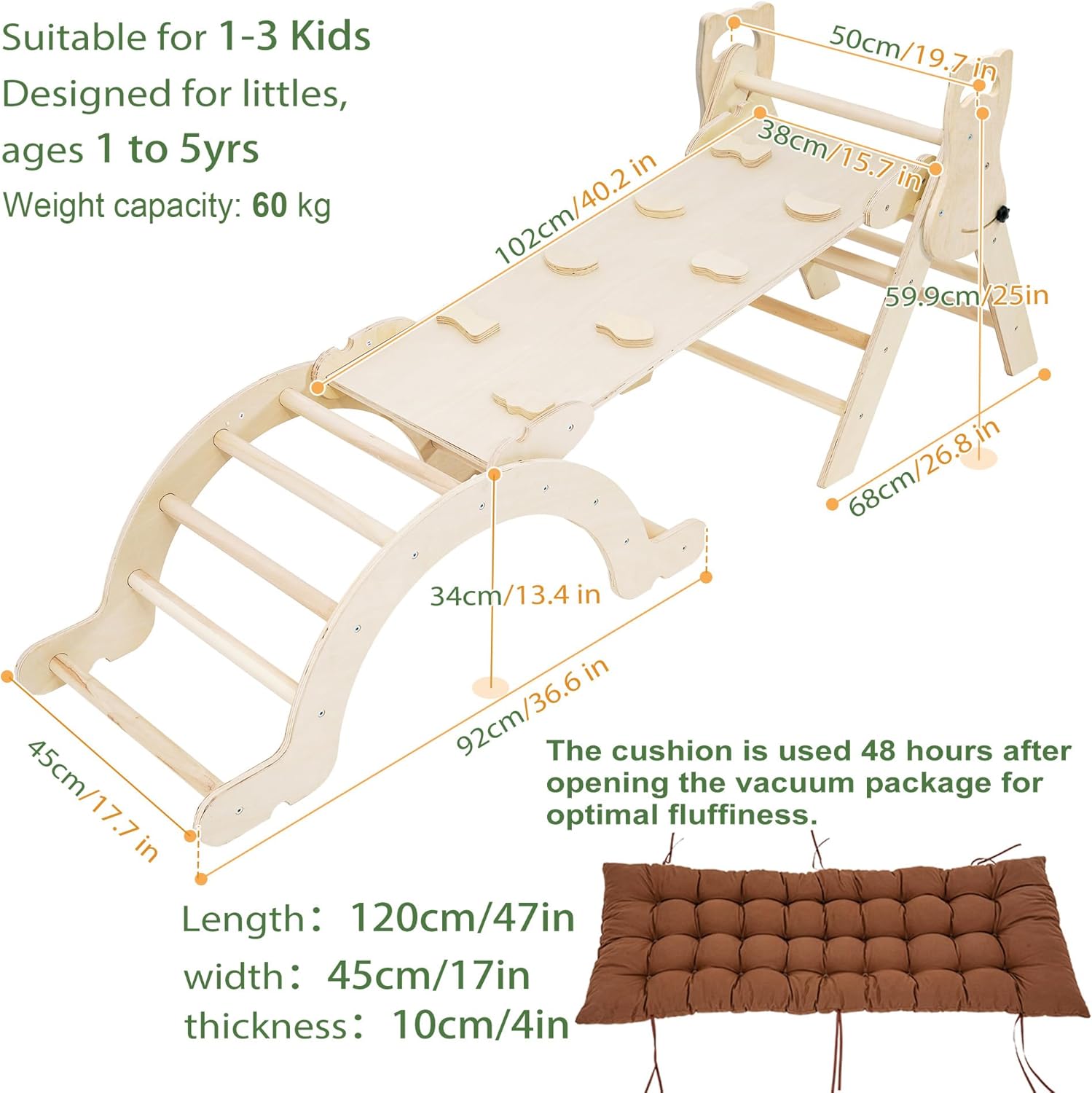 Offrez à votre enfant une aire de jeu polyvalente et sécurisée avec cette arche d’escalade Montessori en bois, équipée d’un toboggan réversible et d’un coussin pour développer muscles, équilibre et imagination.