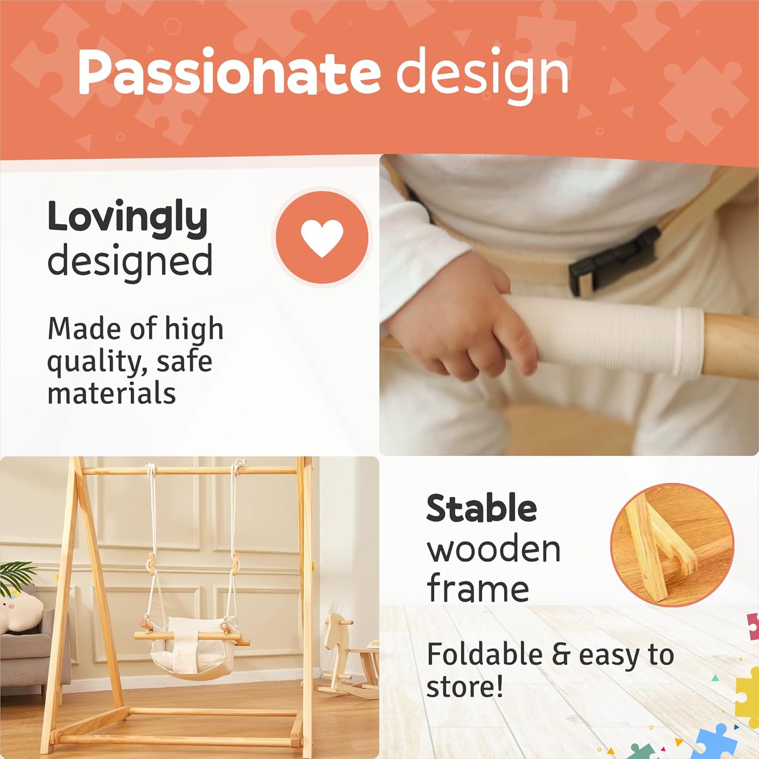 Offrez à votre bébé des moments de joie et de sérénité avec cette balançoire en bois Montessori pliable, sécurisée, compacte et idéale pour une utilisation intérieure et extérieure.
