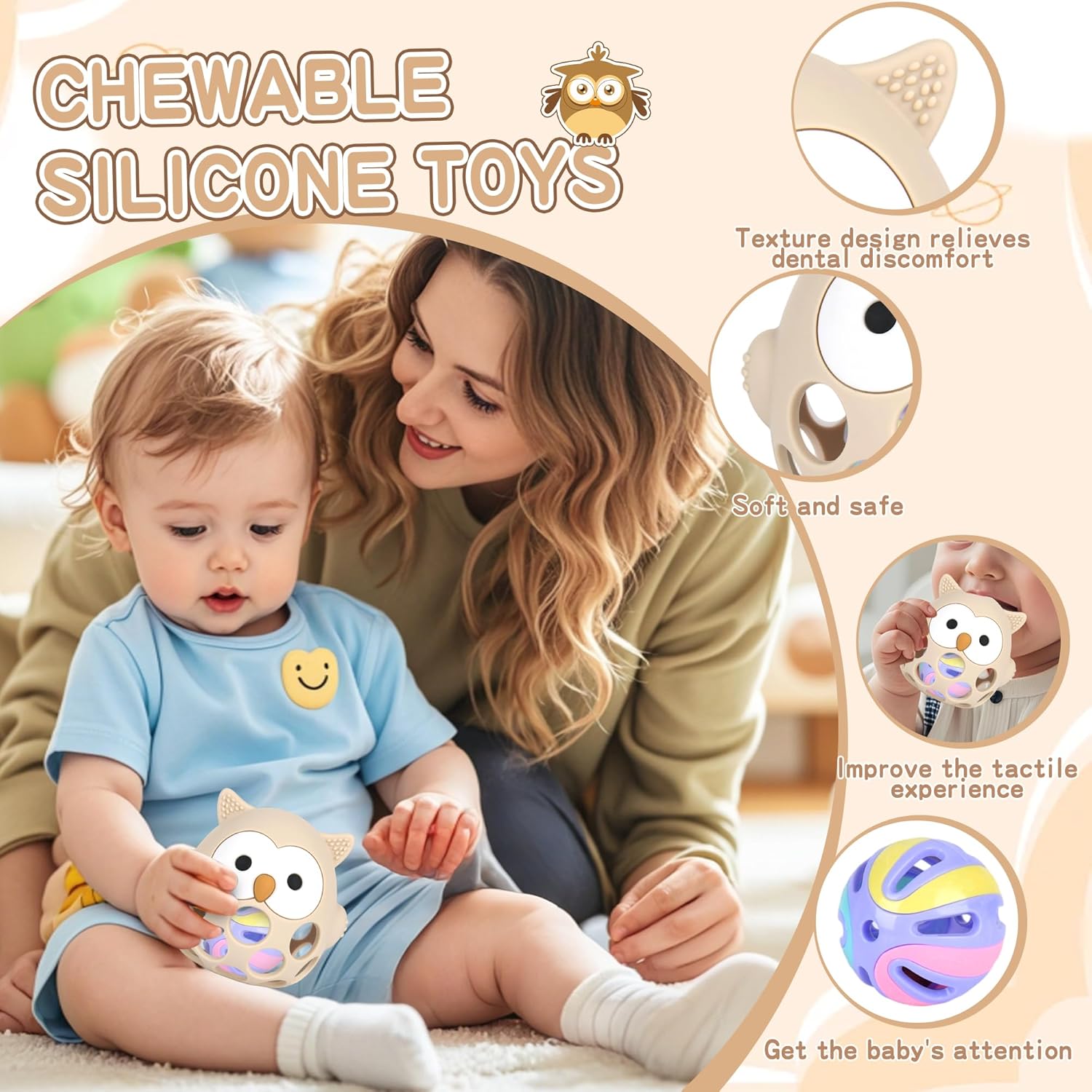 - Soulagement des gencives : Texture souple et picots massants pour apaiser les poussées dentaires.