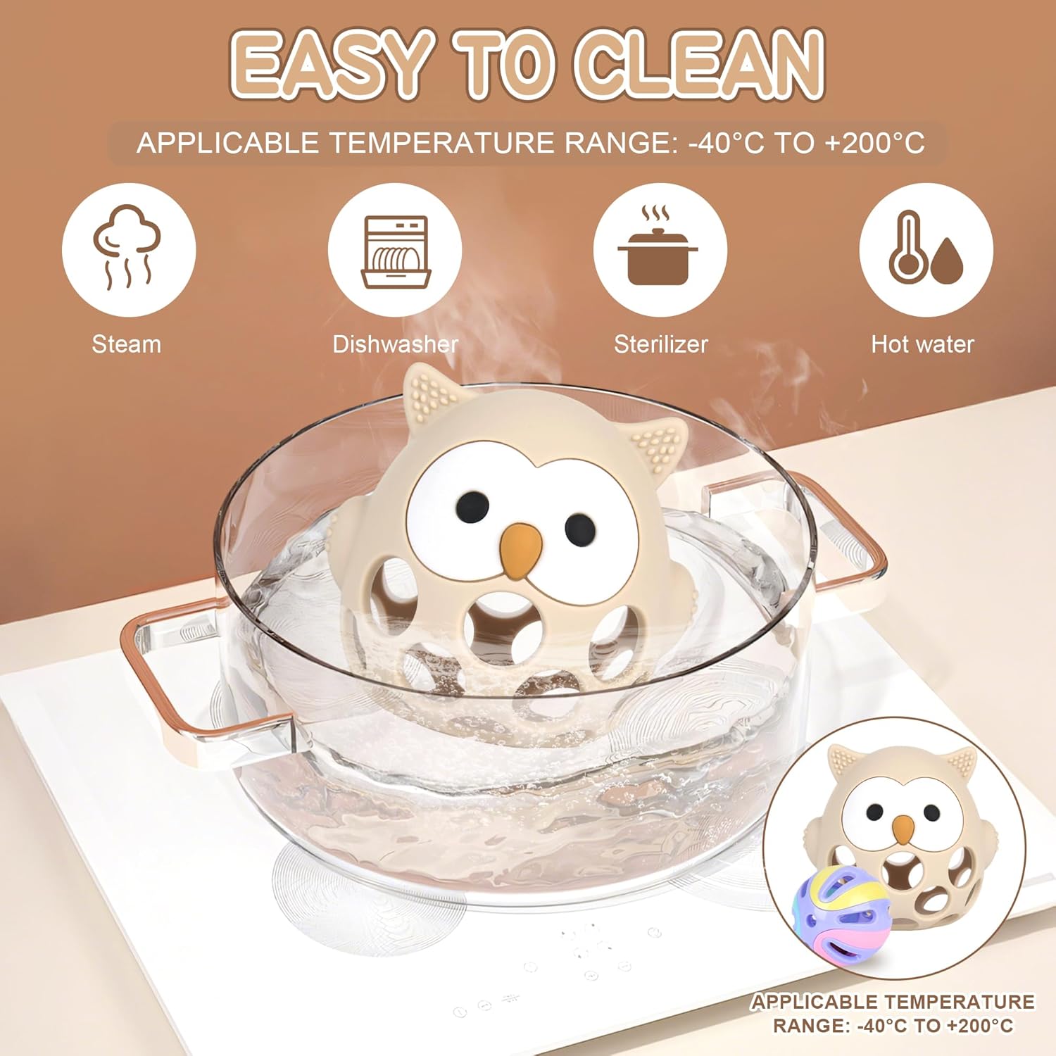 Fabriquée pour résister à l’épreuve du temps, cette balle de préhension est conçue sans coutures afin d’éviter l’accumulation de saletés. Le nettoyage est un jeu d’enfant : il suffit de la rincer à l’eau claire ou de la désinfecter grâce à des méthodes adaptées comme l’eau bouillante, la stérilisation à la vapeur ou encore les rayons UV. Son matériau en silicone sèche rapidement, évitant ainsi tout risque de prolifération bactérienne. Robuste face aux morsures répétées, ce jouet reste intact même après une utilisation prolongée.