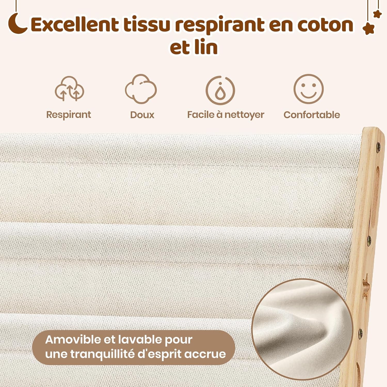 Les niveaux de cette bibliothèque sont équipés de poches en tissu de haute qualité, conçues pour accueillir des livres de différentes tailles. Ces poches sont non seulement robustes mais aussi faciles à nettoyer, garantissant un rangement durable et pratique au quotidien. Votre enfant pourra y organiser ses ouvrages préférés tout en apprenant à maintenir son espace ordonné.