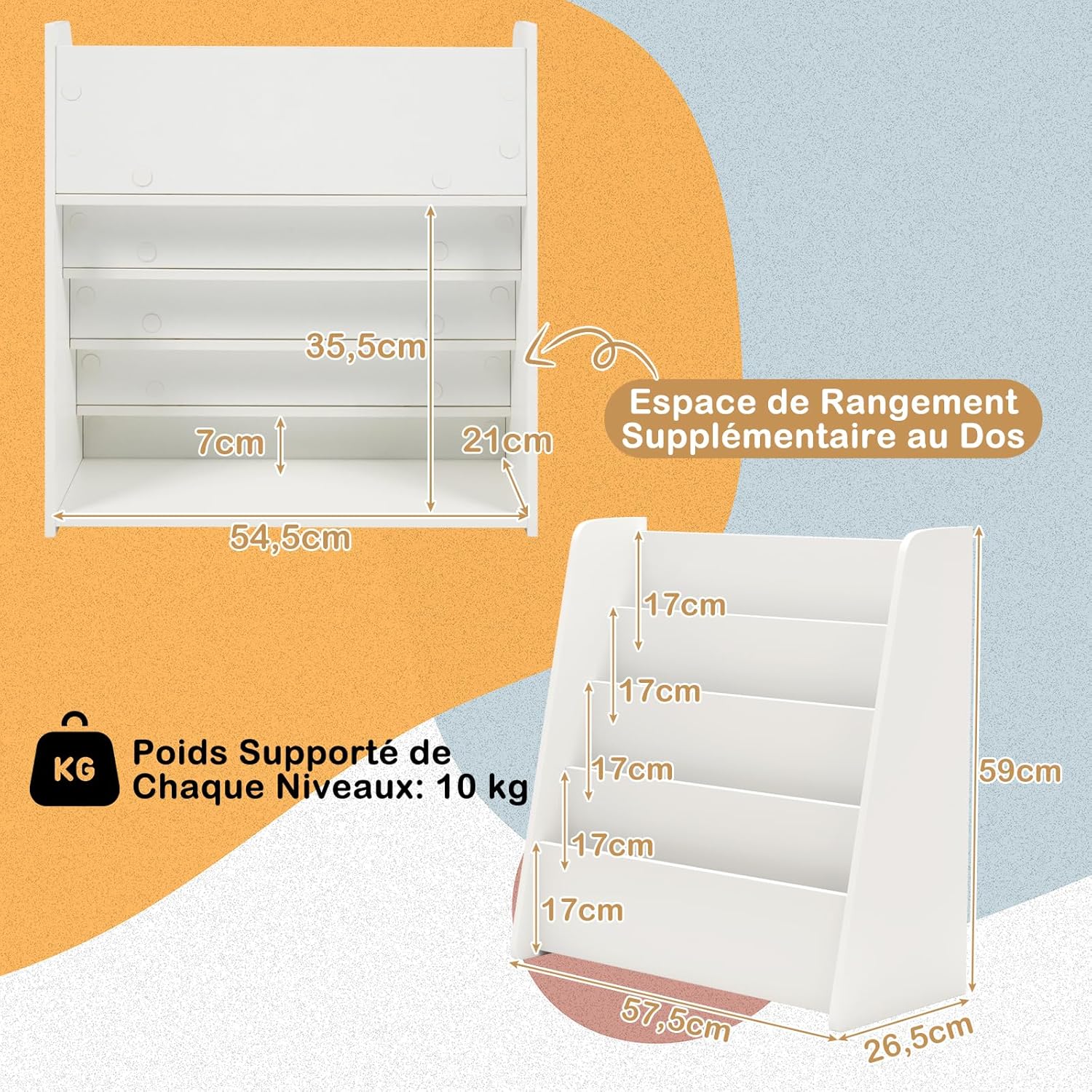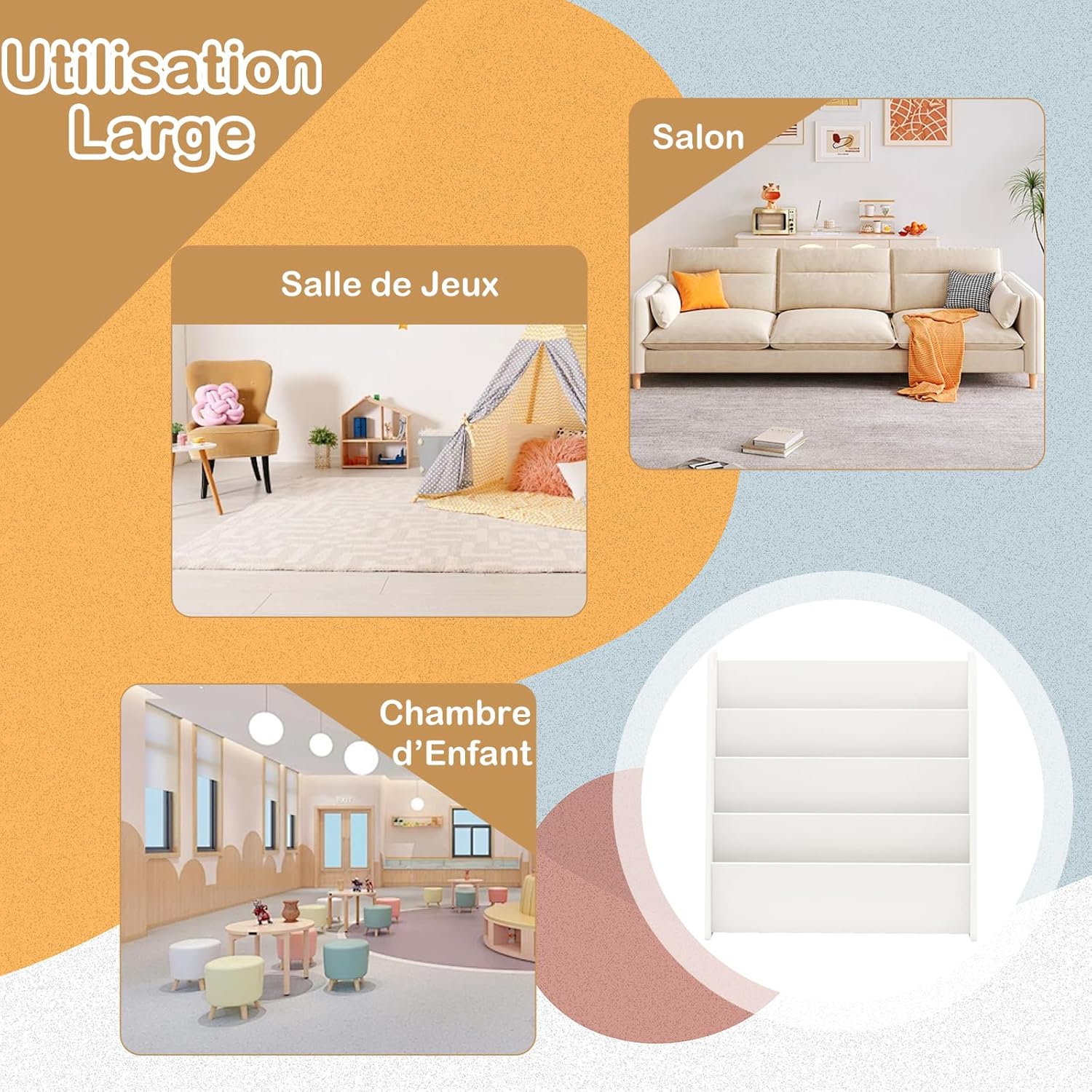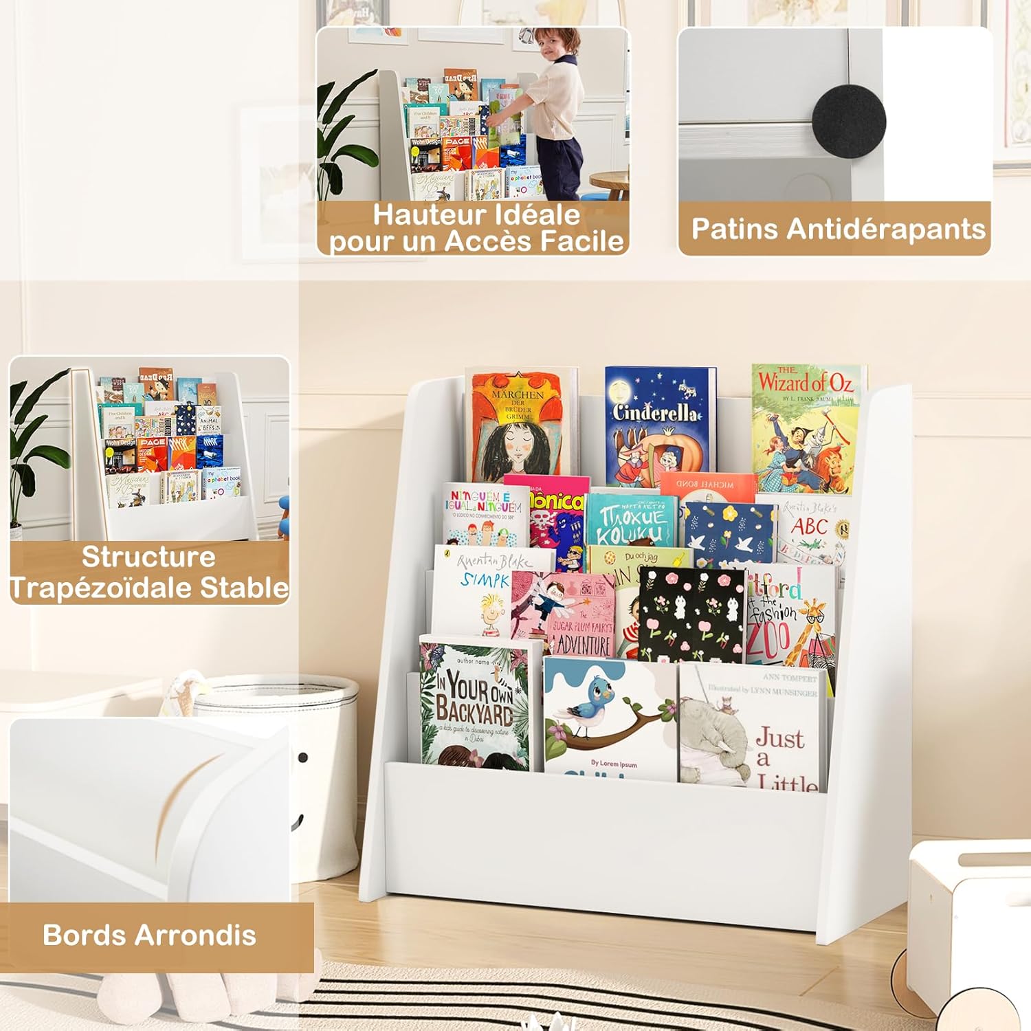 Avec ses quatre niveaux spacieux, cette étagère est idéale pour accueillir une grande variété de livres : des bandes dessinées aux magazines, en passant par les livres d’éveil. Chaque niveau est conçu pour offrir une présentation soignée et un accès facilité, permettant aux enfants de trouver leurs ouvrages préférés en un clin d’œil. En encourageant une organisation claire, cette bibliothèque transforme le rangement en une activité simple et agréable.