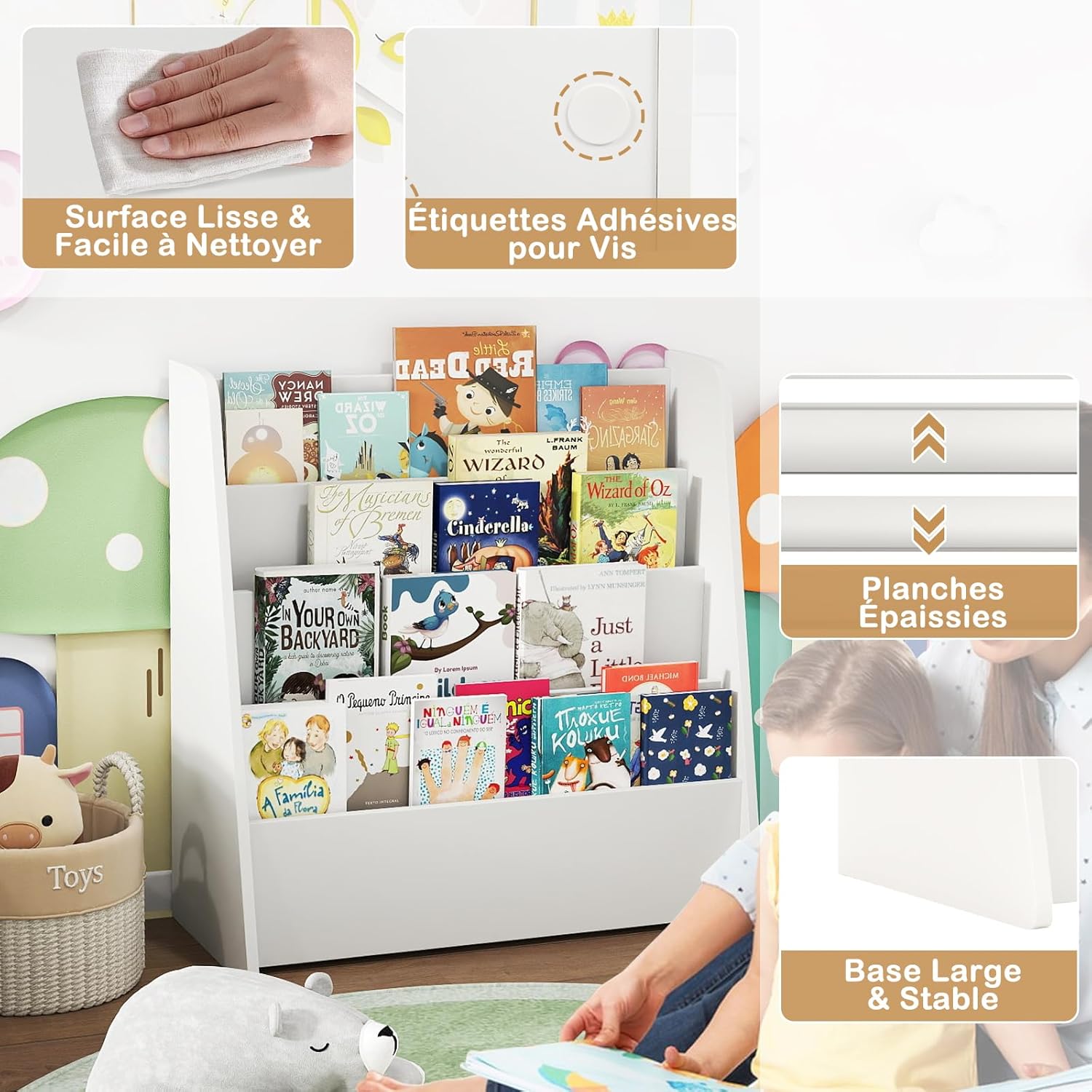 Fabriquée à partir de matériaux robustes, cette bibliothèque se distingue par sa structure trapézoïdale qui assure une stabilité optimale. Sa base large et ses pieds antidérapants offrent une sécurité renforcée, éliminant tout risque de basculement. Vous pouvez ainsi laisser vos enfants explorer leur bibliothèque en toute tranquillité.
