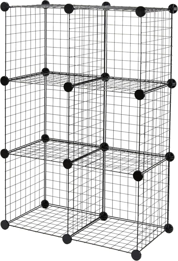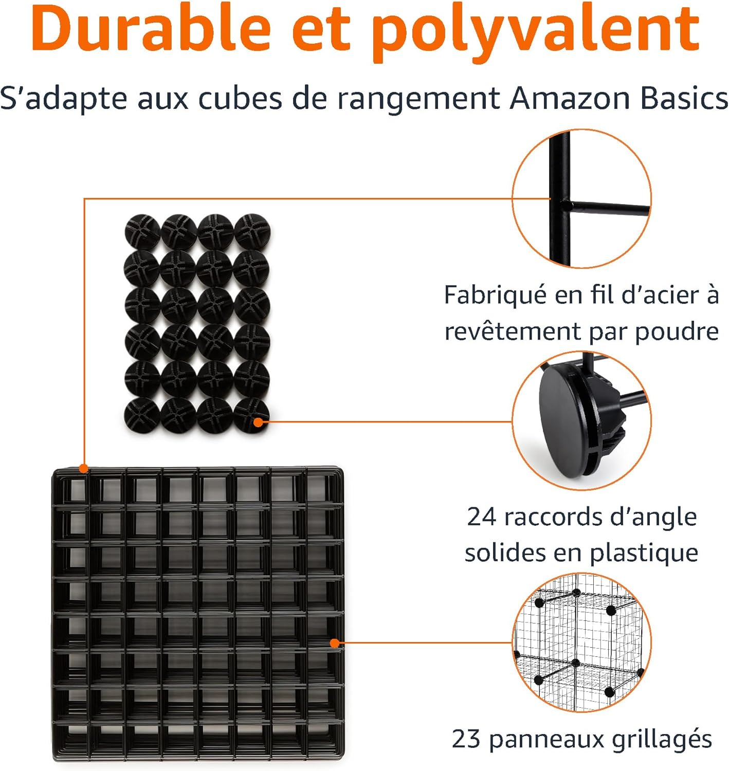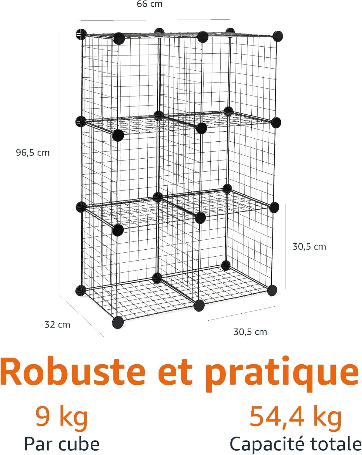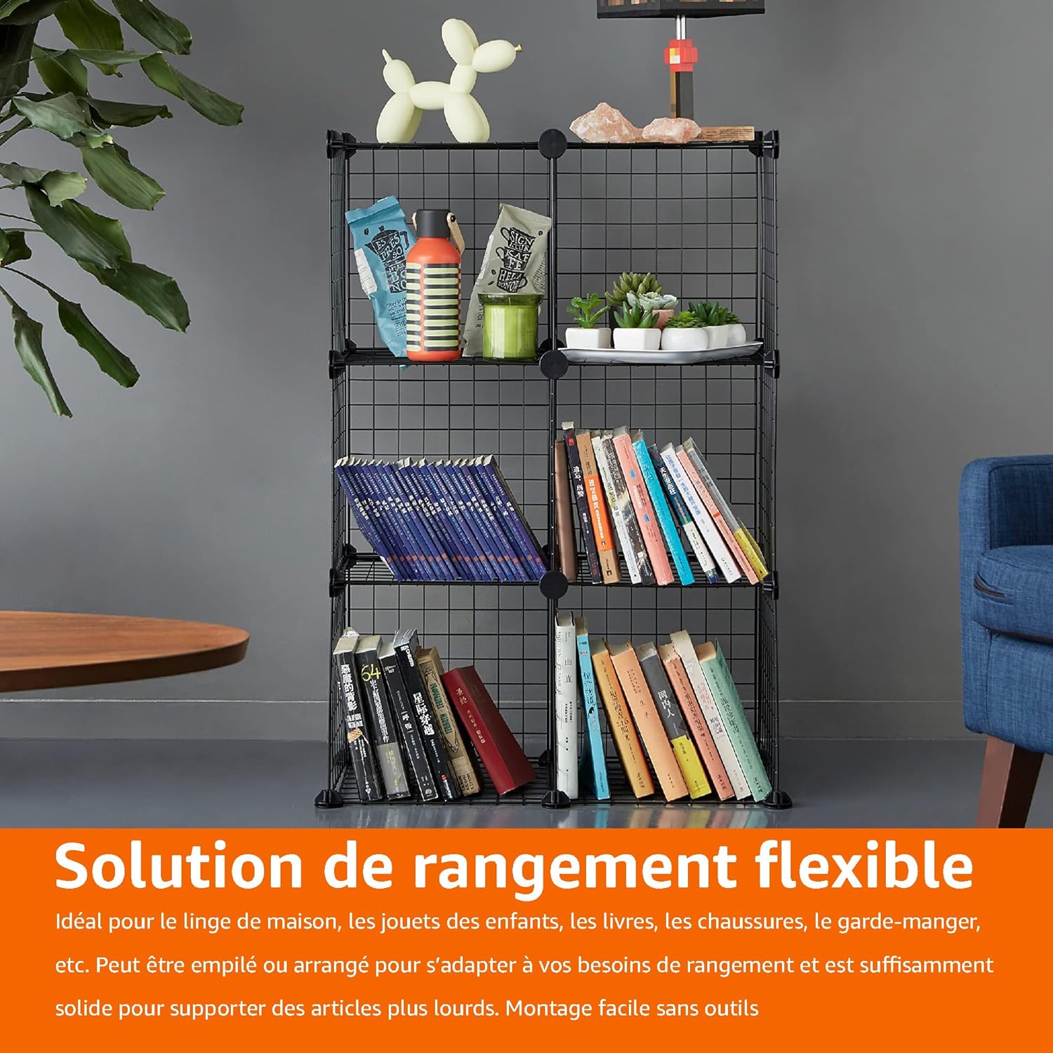 La véritable force de cette bibliothèque réside dans sa conception modulaire unique. Grâce à ses 6 cubes composés de 23 panneaux en fil d’acier noir et de 24 connecteurs d’angle en plastique, vous pouvez l’agencer selon vos envies. Empilez-la verticalement pour un gain d’espace ou configurez-la horizontalement pour un accès simplifié. Et si vos besoins évoluent, il est possible d’étendre la structure en ajoutant des unités supplémentaires.