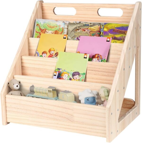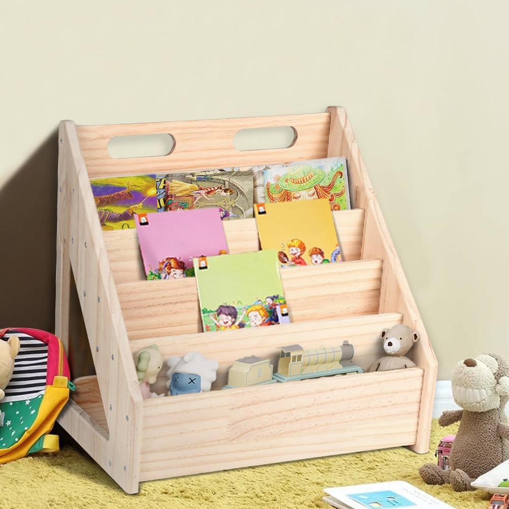 Optimisez l’organisation et stimulez l’autonomie de votre enfant avec cette bibliothèque montessori en bois naturel, au design minimaliste, durable et parfaitement adaptée aux petits espaces.