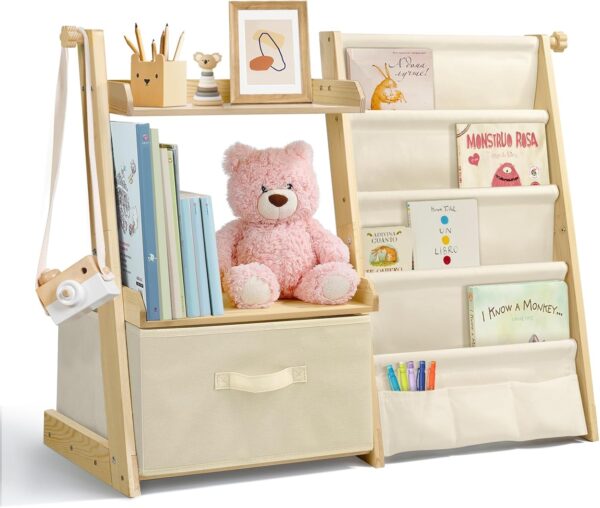 Dotée de 4 niveaux de poches spacieuses, de 2 étagères ouvertes et d’une boîte de rangement pratique, cette bibliothèque est conçue pour accueillir une grande variété d’objets. Livres d’histoires, puzzles, jouets en peluche ou fournitures artistiques, tout trouve sa place sans effort. Les différents espaces permettent de catégoriser facilement les affaires de votre enfant, rendant ainsi le rangement plus ludique et intuitif.