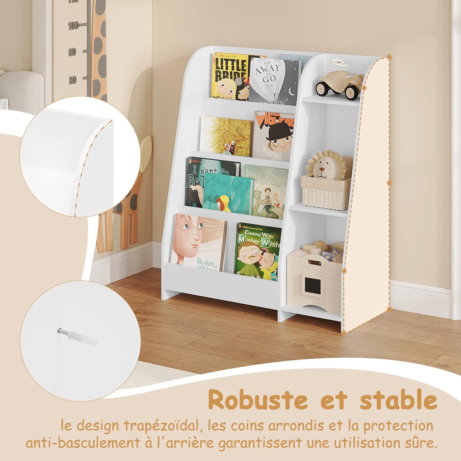 La sécurité est une priorité absolue avec cette bibliothèque pour enfants. Fabriquée en bois d’ingénierie robuste et dotée d’un placage lisse, elle résiste aux épreuves du temps tout en offrant une surface agréable au toucher. Les bords arrondis ont été soigneusement conçus pour éviter tout risque de blessure en cas de choc. De plus, le dispositif anti-basculement inclus permet de fixer solidement l’étagère au mur, garantissant ainsi une utilisation en toute confiance, même dans un environnement animé par les jeux des plus jeunes.