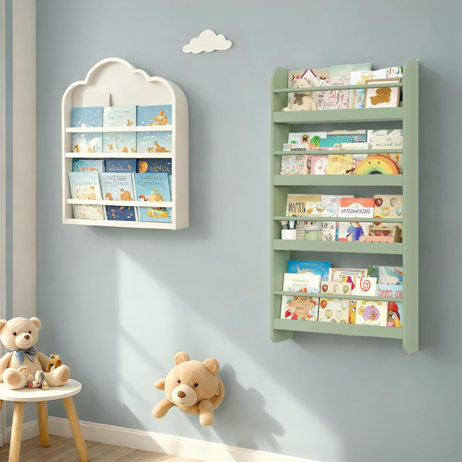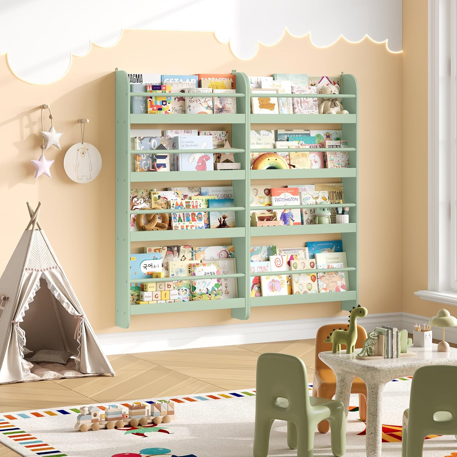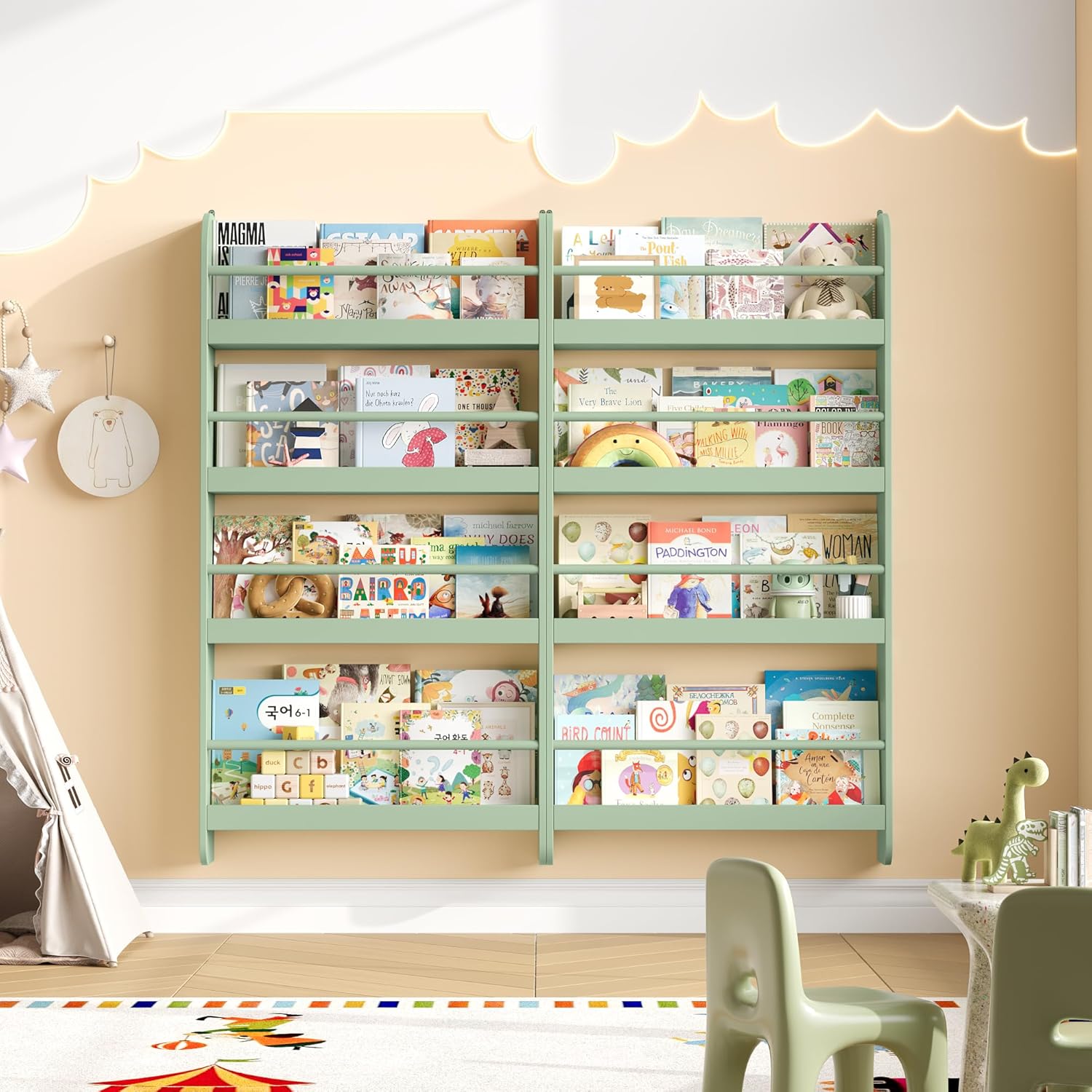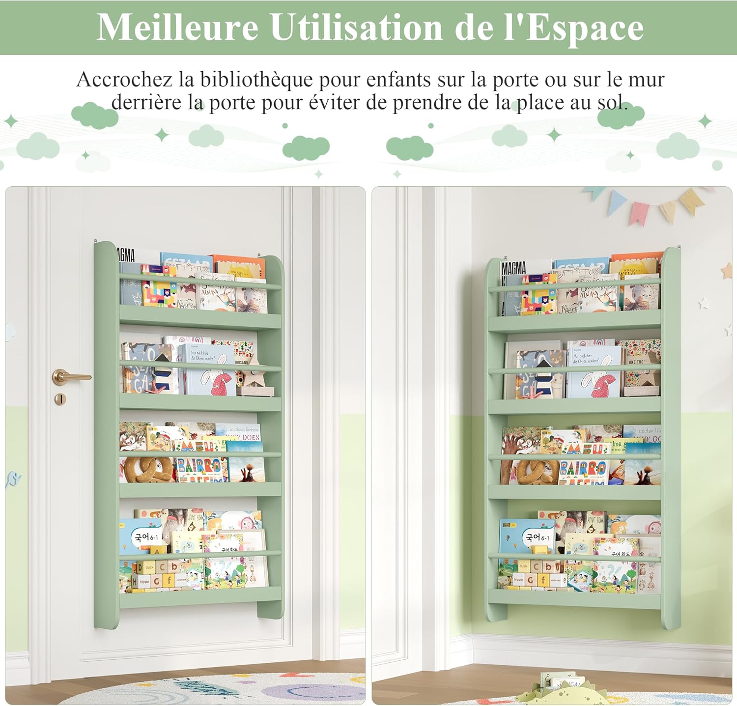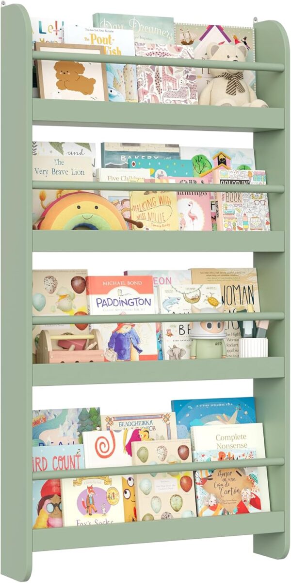 Bibliothèque murale montessori pour enfant avec étagères vertes