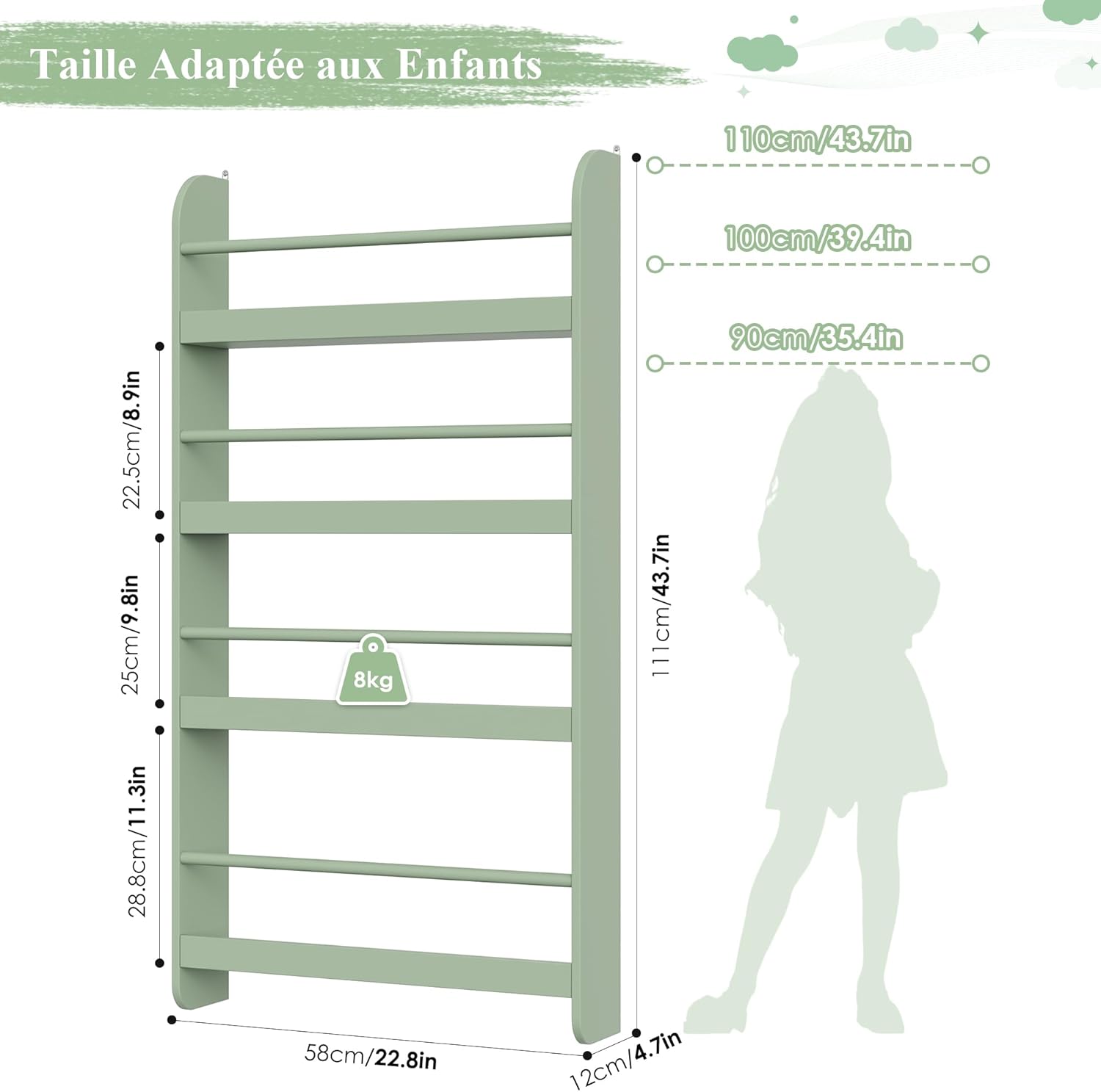 Avec une profondeur de seulement 12 cm, cette étagère murale pour enfant est parfaite pour optimiser les petits espaces. Elle peut être fixée au mur derrière une porte ou dans un coin inexploité, transformant ainsi les zones étroites en un espace de rangement fonctionnel et esthétique. Grâce à ses quatre niveaux, elle peut accueillir environ 35 livres, y compris les grands livres d’images ou d’histoires.