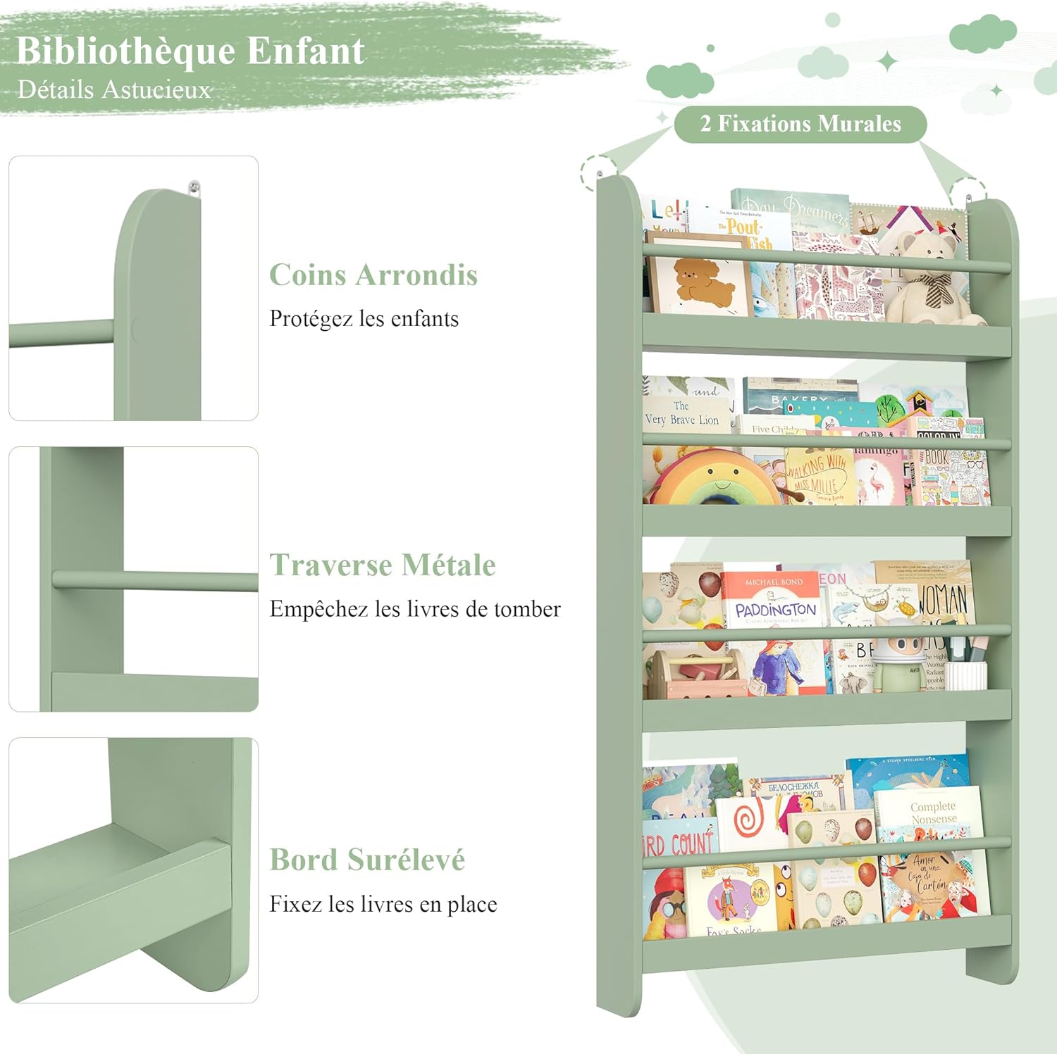 - Sécurité : Fixations murales et bords arrondis.
