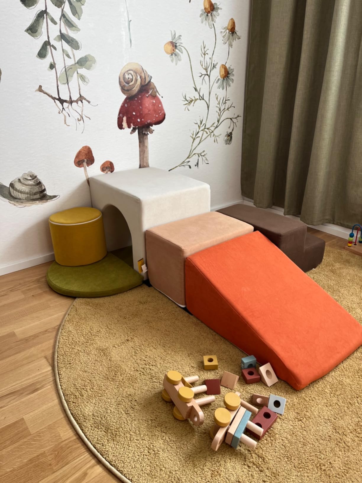 Cet ensemble de bloc est génial ! À l’ouverture ils sont compressés. Il faut donc leur laisser le temps de prendre leur forme normale. Le tissu est doux, les blocs solides. Les enfants peuvent monter, escalader, passer dans le tunnel et tout ça en toute sécurité. Parfait pour la motricité, j’aime beaucoup