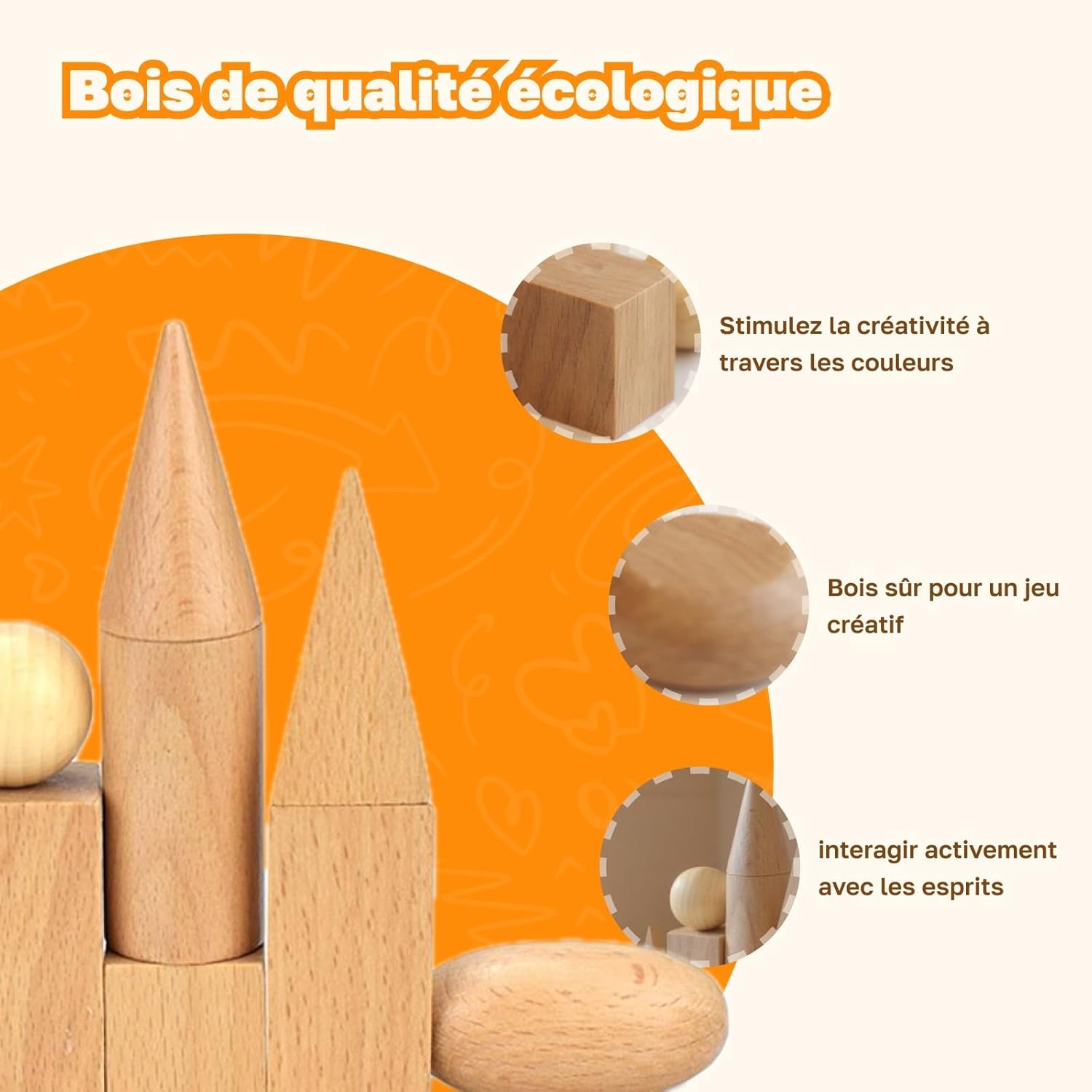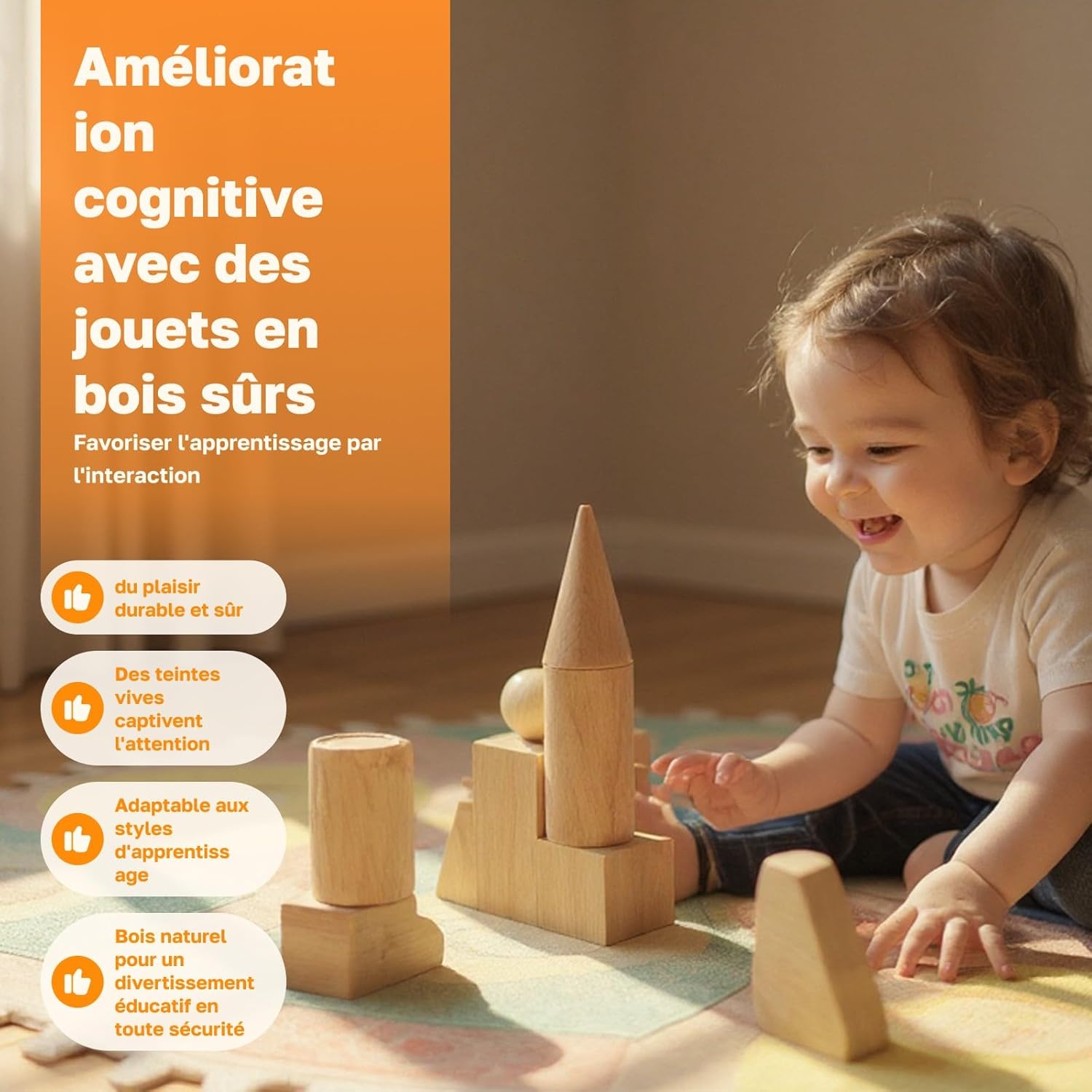 Offrez à vos enfants un apprentissage ludique des formes 3D et des volumes grâce à ces blocs géométriques en bois Montessori, conçus pour stimuler leur créativité et développer leurs compétences motrices fines.