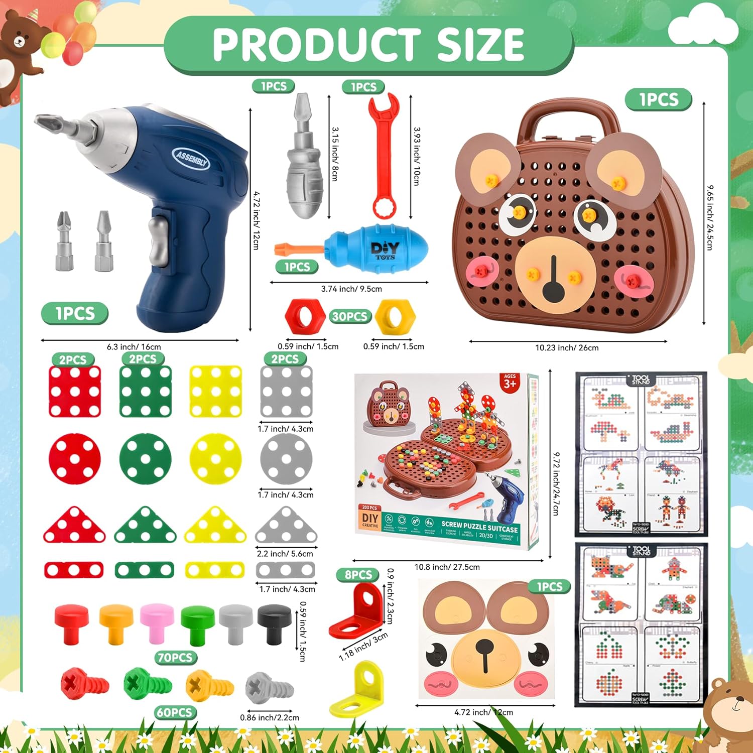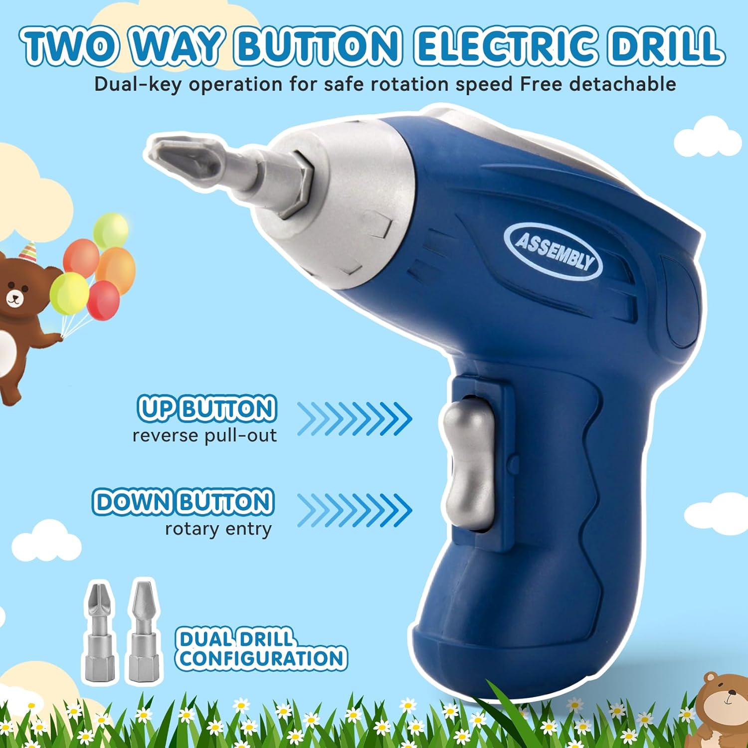 - 1 perceuse électrique adaptée aux enfants (piles non incluses) pour une manipulation en toute sécurité,