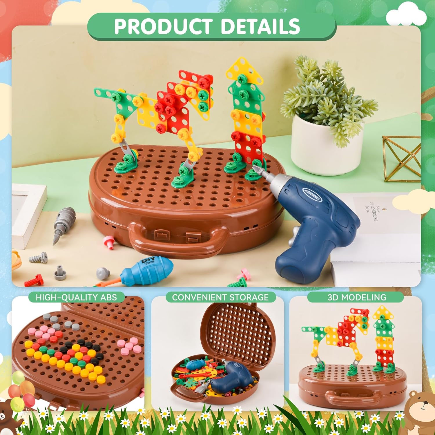Offrez à votre enfant une boîte à outils Montessori magique avec perceuse pour développer sa créativité, sa coordination et son imagination dès 3 ans, grâce à ses 206 pièces colorées et ludiques.