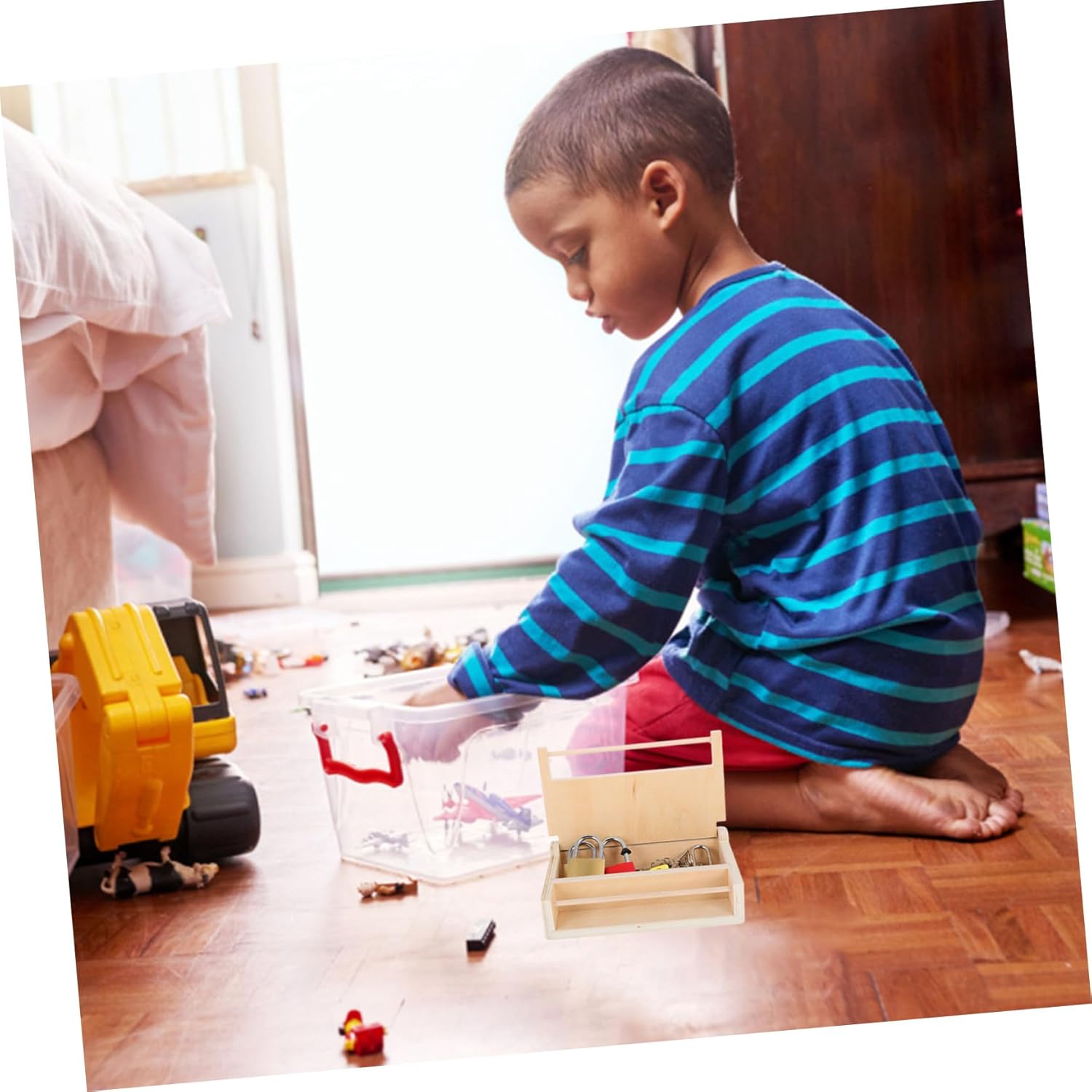 Avec ses nombreuses serrures et mécanismes, cette boîte offre une expérience riche et diversifiée. Chaque serrure, cadenas ou loquet représente un défi unique, incitant l’enfant à explorer et à résoudre des problèmes de manière ludique. Ce jeu éducatif favorise également la coordination œil-main, essentielle au développement des habiletés manuelles.