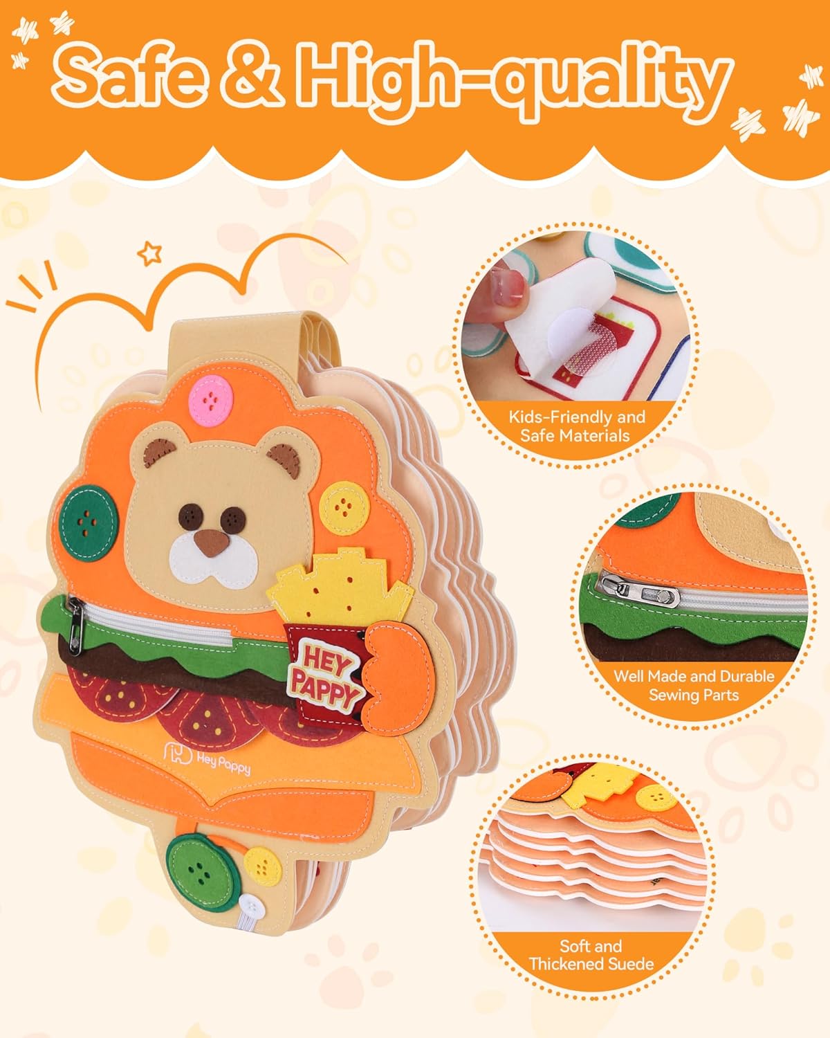 La sécurité est une priorité absolue. Fabriqué en feutre doux et sans arêtes vives, ce busy board garantit une expérience de jeu sans danger. Toutes les pièces sont solidement fixées pour éviter tout risque de détachement. Ce jouet est non seulement durable mais également conçu pour résister à l’énergie débordante des tout-petits. Vous pourrez ainsi laisser votre enfant explorer en toute sérénité.