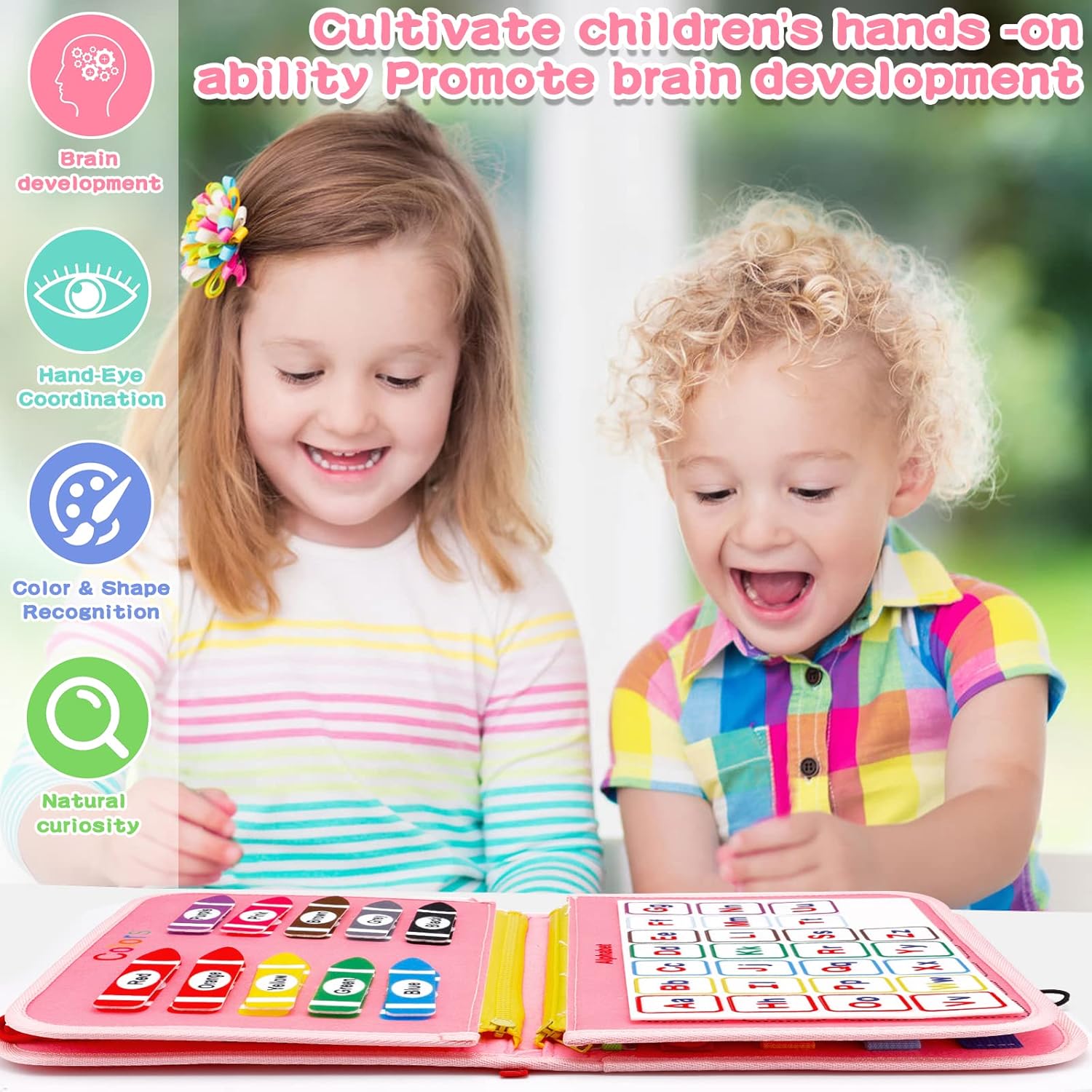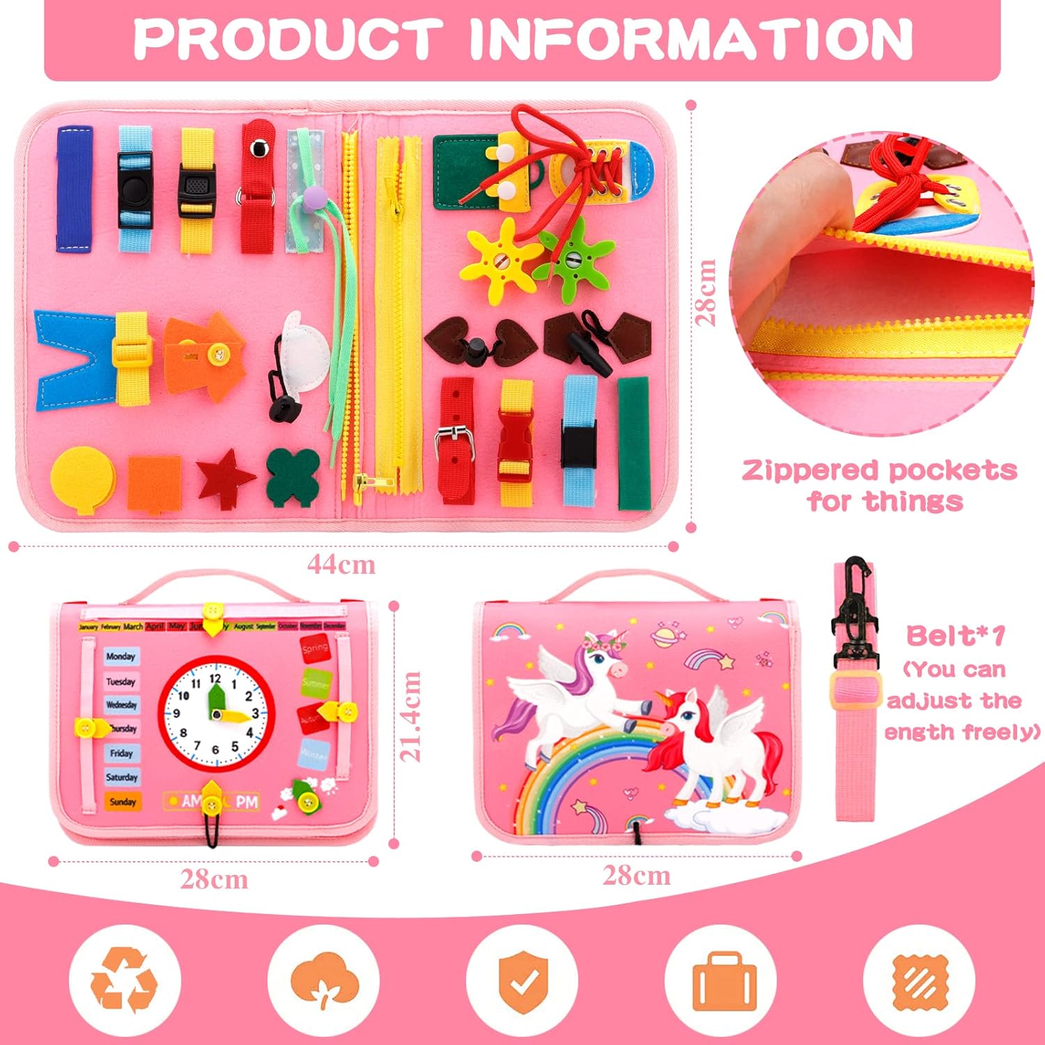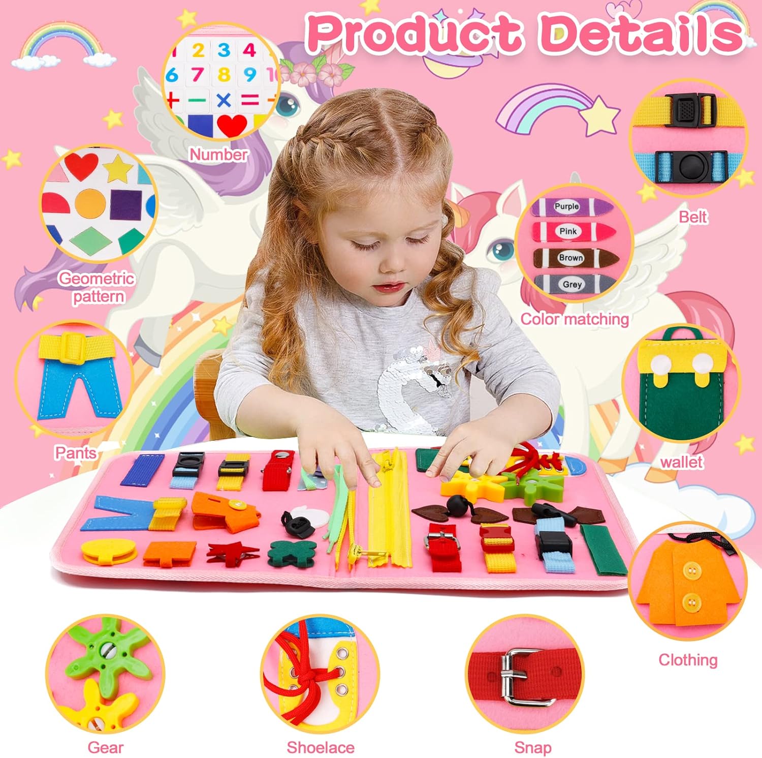 - 30 activités stimulantes : Boucles, fermetures éclair, chiffres détachables et bien plus encore.