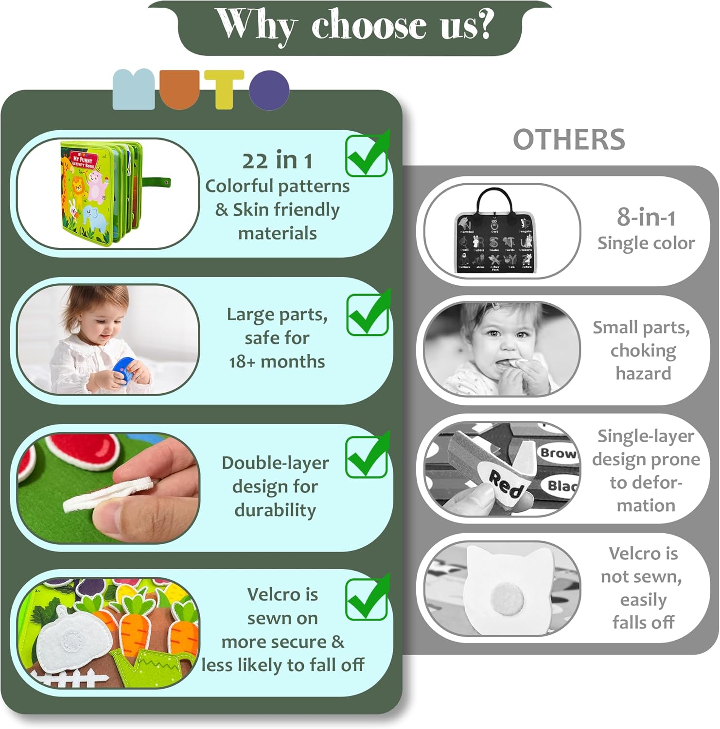 J’ai acheté ce livre éducatif pour ma nièce de 2 ans. Ce livre propose 22 jeux positionnés sur 10 pages. Ce livre montessori permet d’apprendre les couleurs, les formes, les lettres, les heures, la météo…il développe la motricité, on peut coller et recoller les formes aux différents endroits avec les scratches. Il est très léger et permet de l’emmener partout pour occuper l’enfant tout en apprenant et s’amusant! Ravie de mon achat