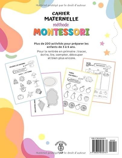 Offrez à votre enfant le Cahier Maternelle Montessori XXL avec plus de 200 activités éducatives pour apprendre en s’amusant : traçage, découpage, coloriage, découverte des saisons, chiffres, lettres et bien plus encore !