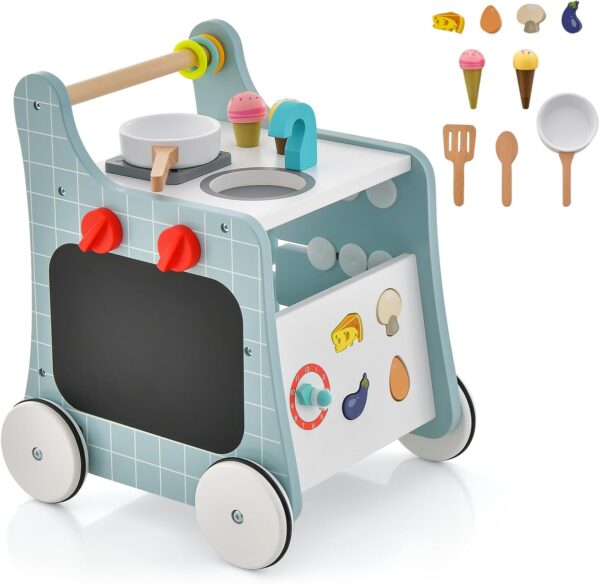 Offrez à votre bébé un chariot de marche en bois 6 en 1 polyvalent alliant trotteur, cuisine simulée, rangement et jeux éducatifs pour éveiller sa créativité en toute sécurité.