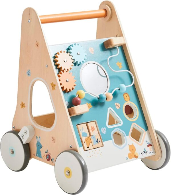 Offrez à votre enfant dès 12 mois un chariot de marche en bois avec freins, combinant sécurité, rangement et activités ludiques pour développer sa motricité et son éveil.