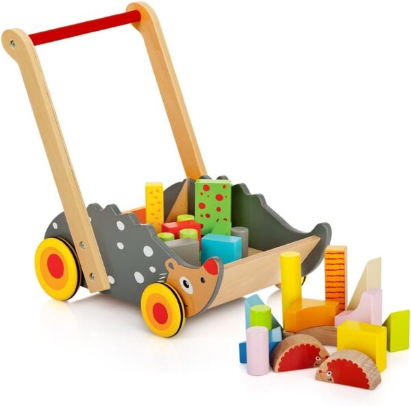 Offrez à votre bébé un chariot de marche en bois éducatif, robuste et sécurisé, avec 25 blocs colorés pour stimuler sa motricité, sa créativité et accompagner ses premiers pas en toute confiance.