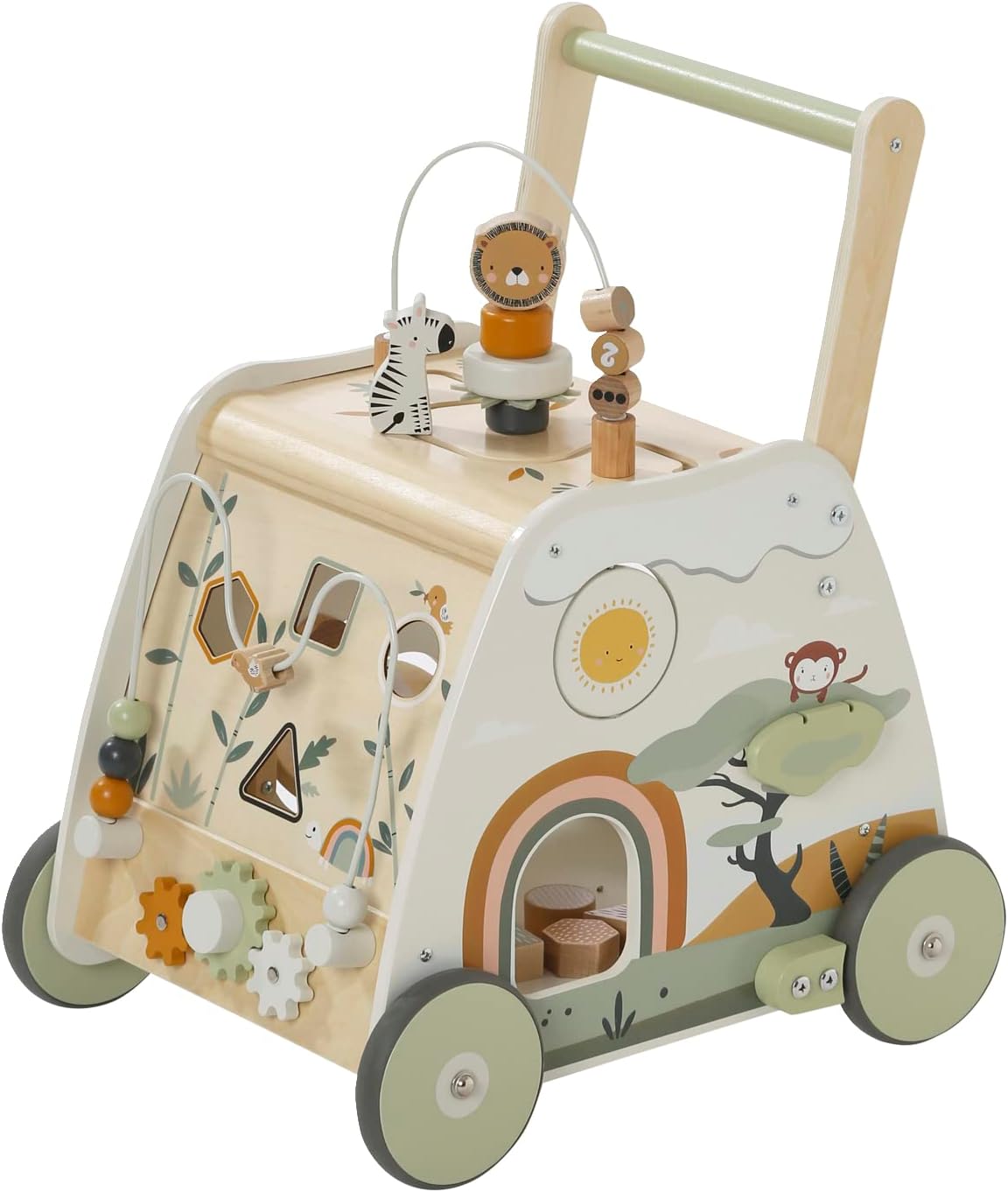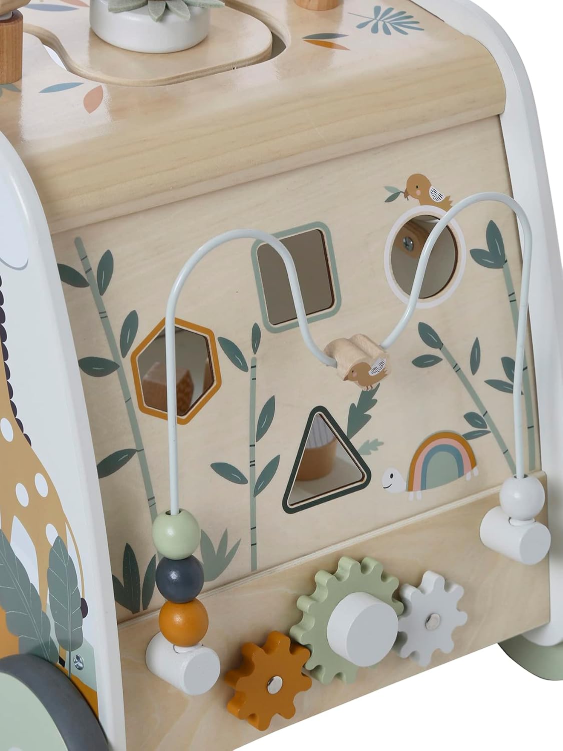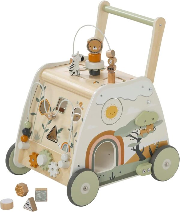 Stimulez l’éveil de votre enfant avec ce chariot de marche en bois multi-activités Tanzanie vert, alliant sécurité, apprentissage et jeu grâce à ses nombreuses activités ludiques et éducatives.