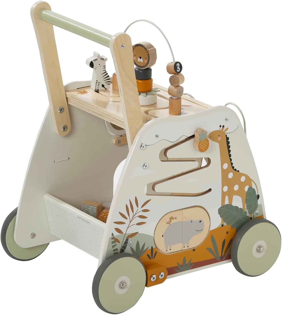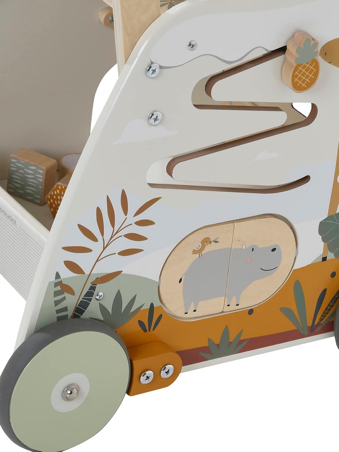 Conçu en bois de qualité supérieure, ce chariot allie robustesse et esthétique. Sa teinte verte douce et ses motifs inspirés de la faune africaine en font un objet aussi charmant qu’éducatif. Les roues sont équipées de freins ajustables pour garantir une stabilité optimale et accompagner votre enfant en toute sécurité dans son apprentissage de la marche. Un équilibre parfait entre plaisir et sérénité pour les parents.