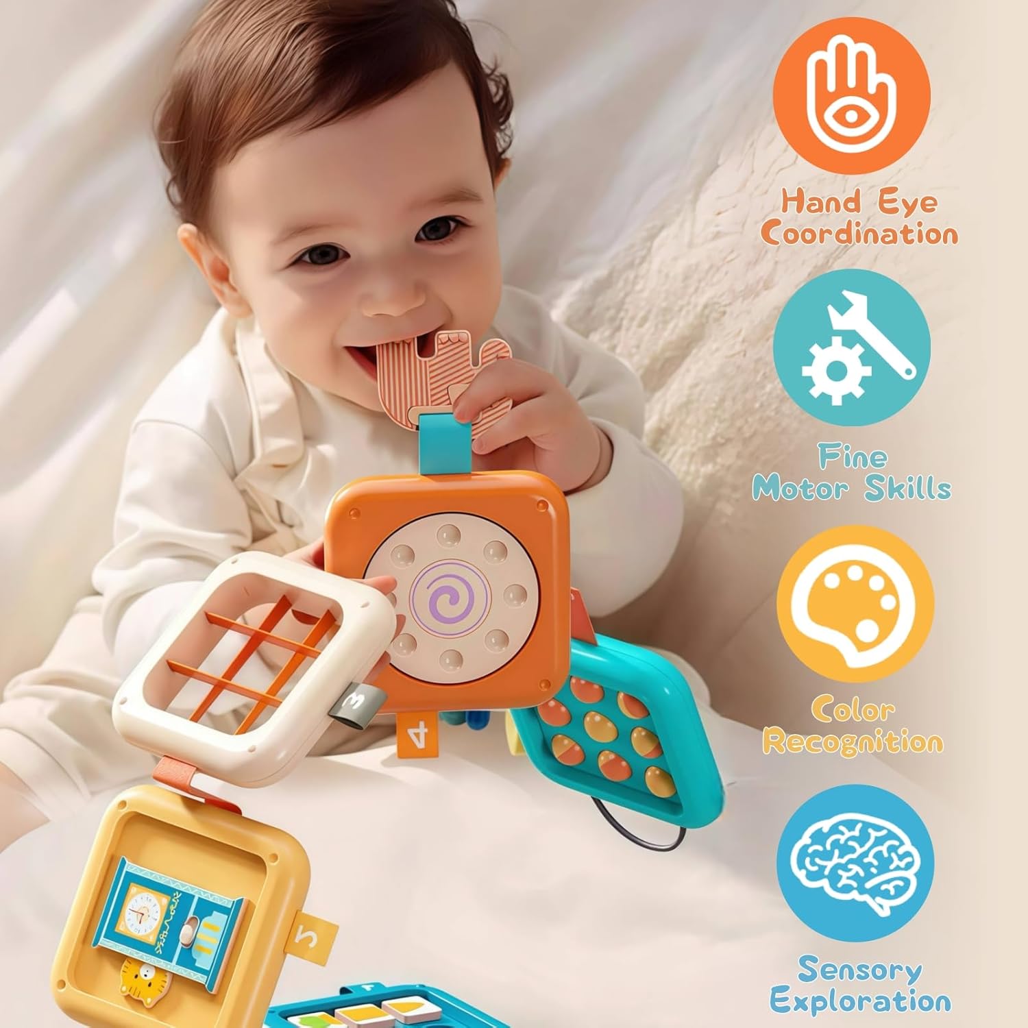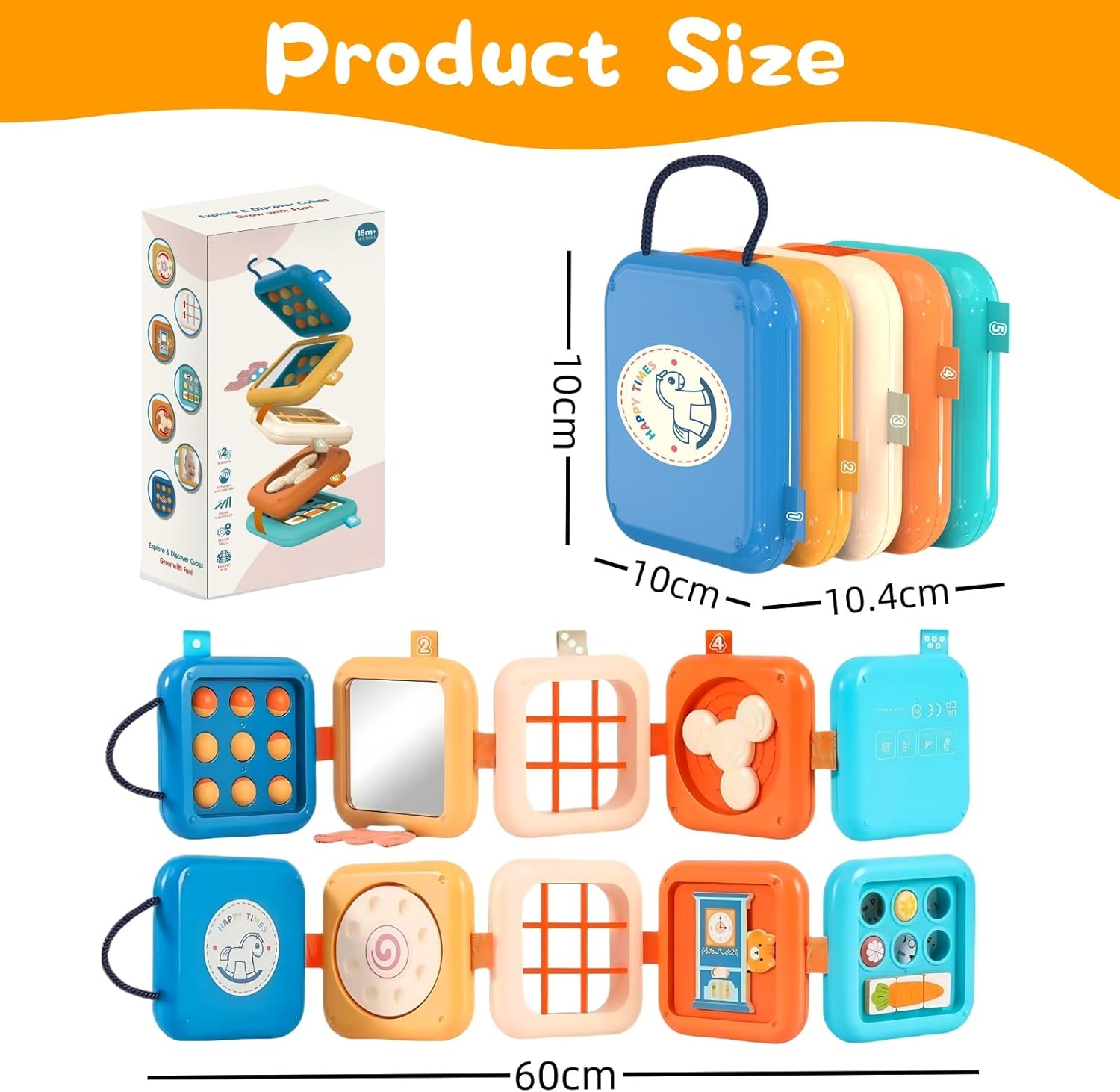 Ce cube d’activité est un véritable trésor d’activités interactives et éducatives. Chaque face propose une nouvelle activité pour éveiller les sens et encourager l’apprentissage autonome :