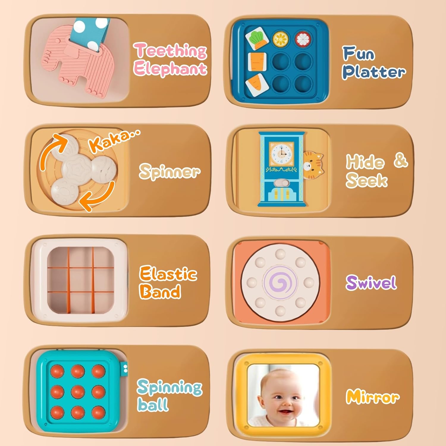 8 activités pour les plus petits, ils permettent d'attirer l’attétion des enfants tout en leur apprenant à développer leur motricité fine, Très simple a ranger car le tout se replie parfaitement bien sur eux-même.