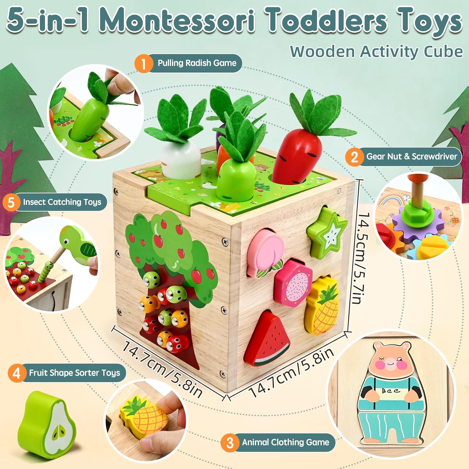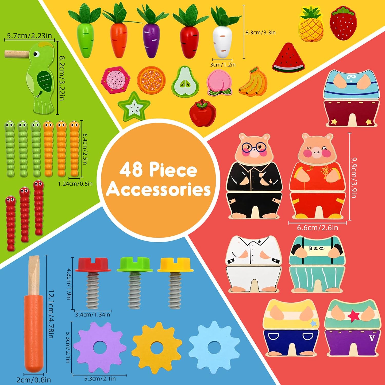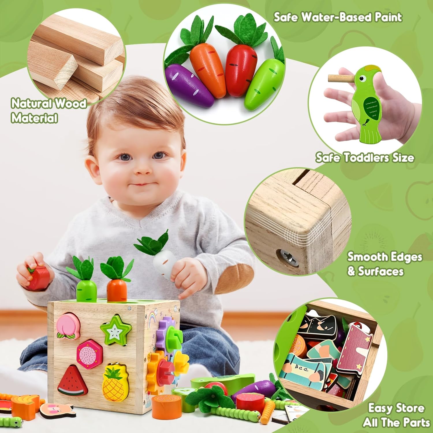 • Contenu : Cube d’activité, blocs de fruits, pic magnétique, vers, puzzles de vêtements, tournevis, écrous et vis, carottes colorées.