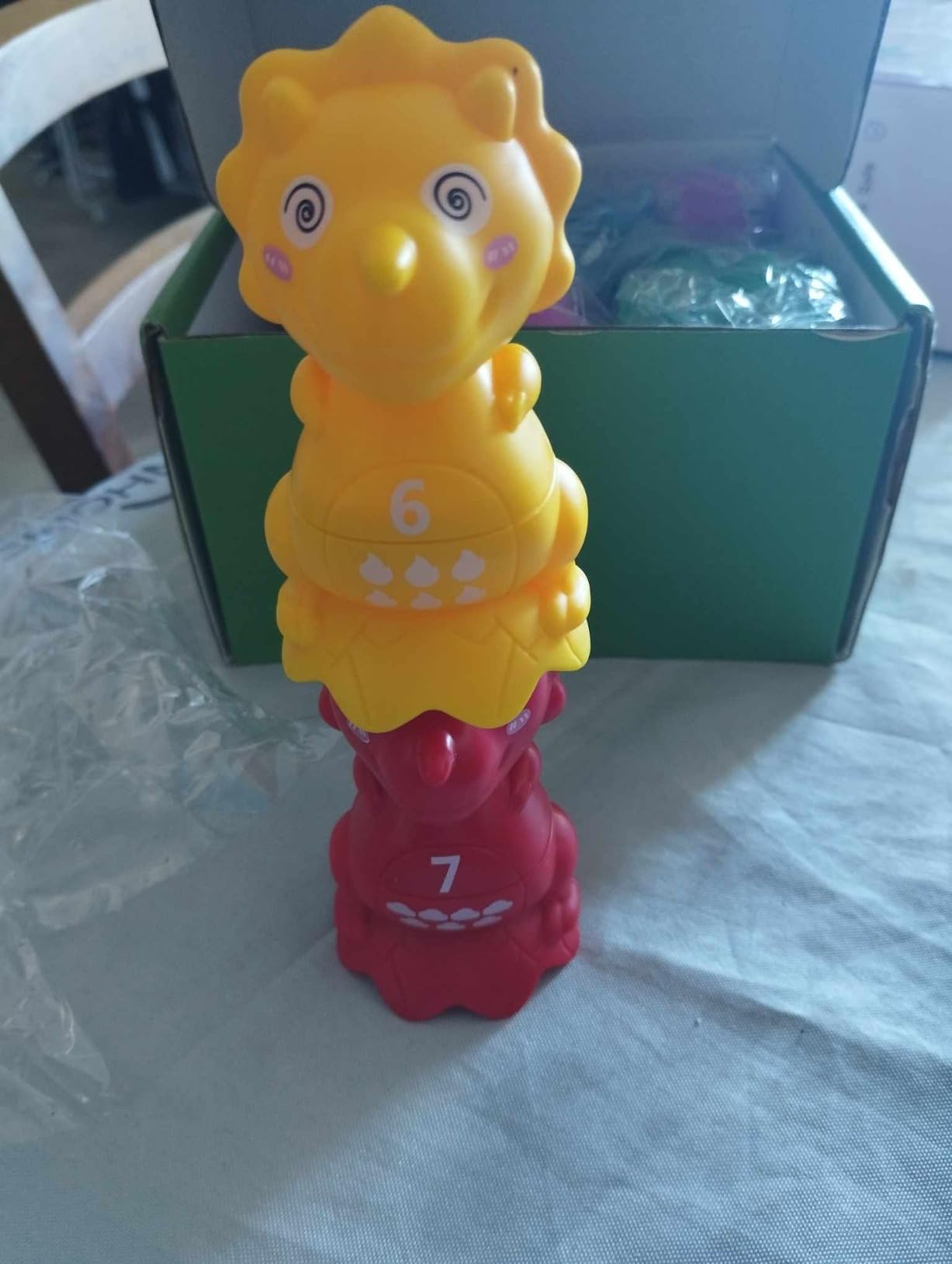 I got the Dinosaur Stacking Matching Toys for my niece to use in her paddling pool, and she seems to enjoy them. While she has some difficulty stacking them, I believe she will improve as she grows. These toys are excellent for developing fine motor skills. They are also great for colour and shape recognition. Overall, they are a wonderful addition to her playtime and beneficial for her development.