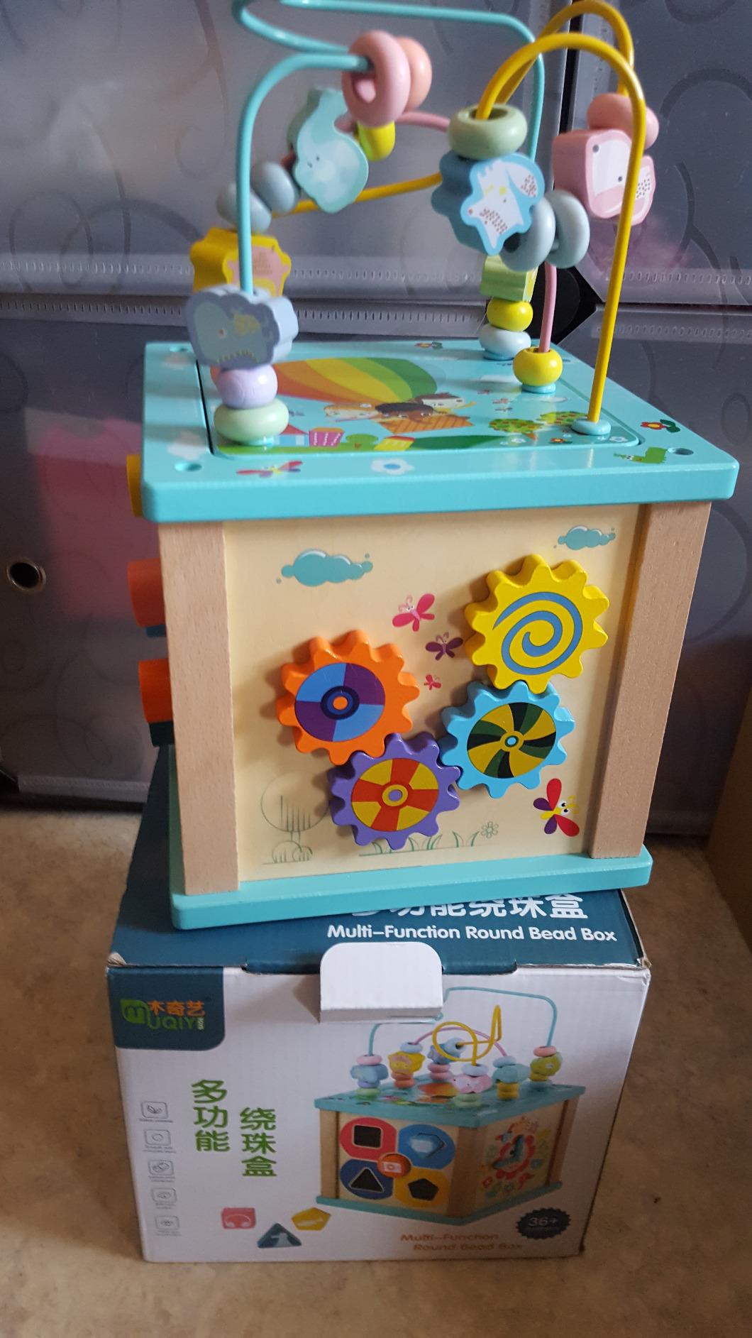 Acheté en avance en attendant que bébé grandisse encore un peu pour lui donner en toute sécurité ce jouet a l'air idéal pour son éveil. Il est tout en couleur et on y retrouve 5 jeux différents que se soit insérer des pièces de différentes formes dans les trous correspondant, un jeu d'horloge tout mignon, 1 petit jeu de labyrinthe qui permet de glisser des pièces numérotés, 1 jeu avec des petites pièces d'engrenages, ou encore le jeu sur le dessus qui va permettre de faire glisser des pièces le long des tiges. Prend pas beaucoup de place tout se range à l'intérieur et le dessus se retourne pour se remettre dedans pour ne rester qu'un cube, pratique pour le ranger dans la chambre. Je suis vraiment très contente de mon achat et j'ai hâte de voir bébé jouer avec.