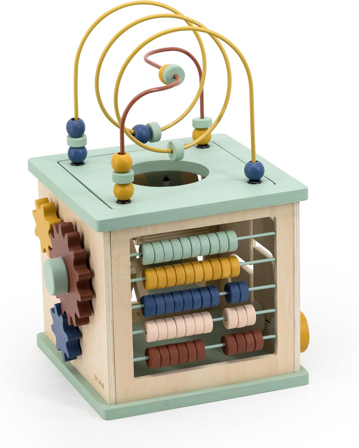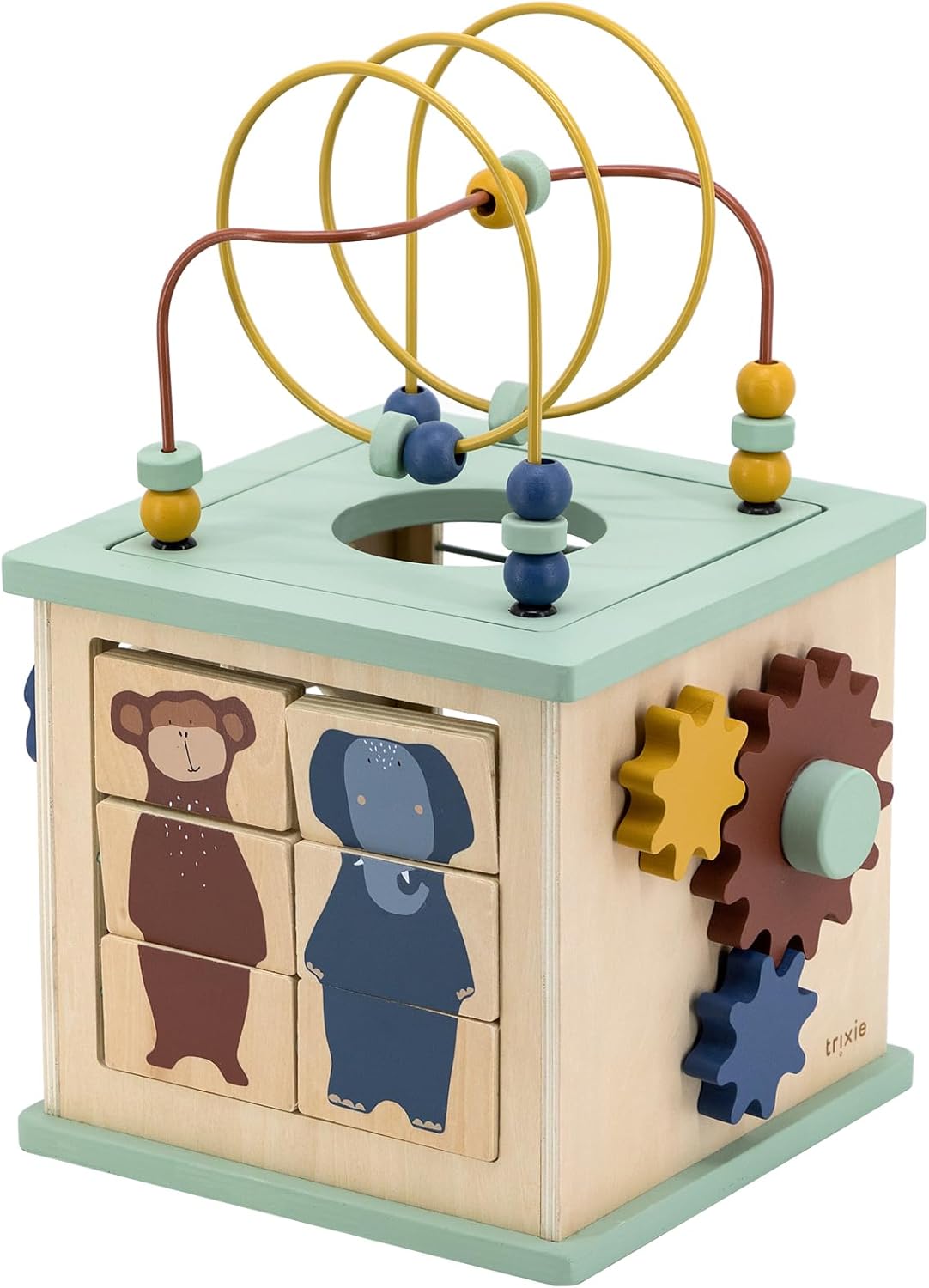 Le cube d’activités en bois animaux Trixi offre 5 activités stimulantes pour développer la motricité fine et la perception spatiale dès 1 an.