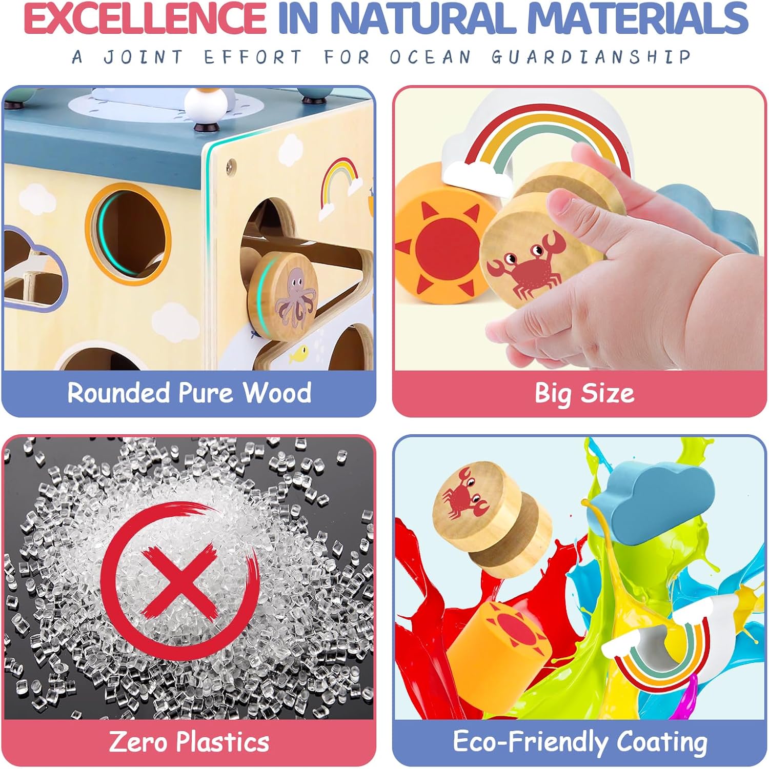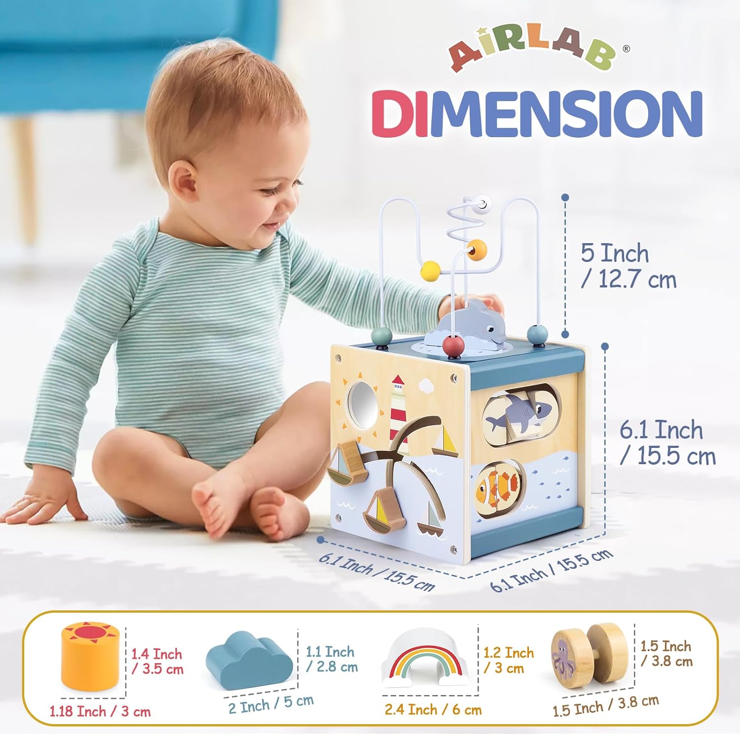 Qu’il s’agisse d’un anniversaire, de Noël, de Pâques ou même d’une fête spéciale, ce cube d’activités en bois est le cadeau parfait pour émerveiller votre enfant. Avec ses nombreuses activités interactives et ses couleurs attrayantes, il deviendra rapidement le compagnon préféré des tout-petits. Chaque côté du cube raconte une histoire : baleines bondissantes, poissons-clown nageurs, soleil radieux et voiliers guidés par un phare… Une invitation à l’imaginaire qui occupera votre enfant pendant des heures loin des écrans.