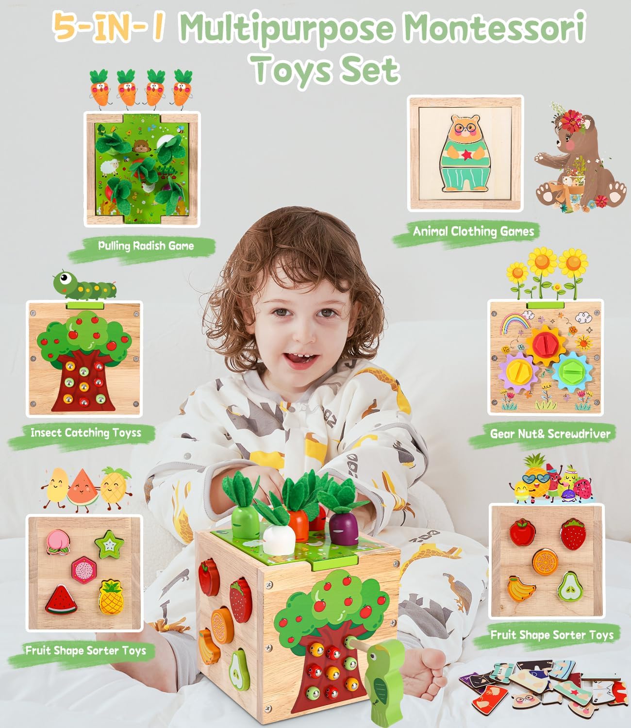 Offrez à votre bébé un cube d’activités Montessori 8 en 1, alliant éveil, motricité et apprentissage ludique grâce à ses jeux variés et sa conception sûre en bois naturel.