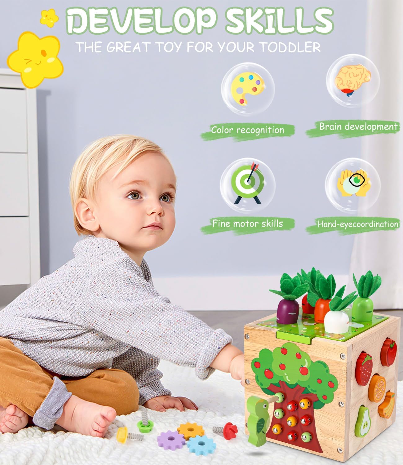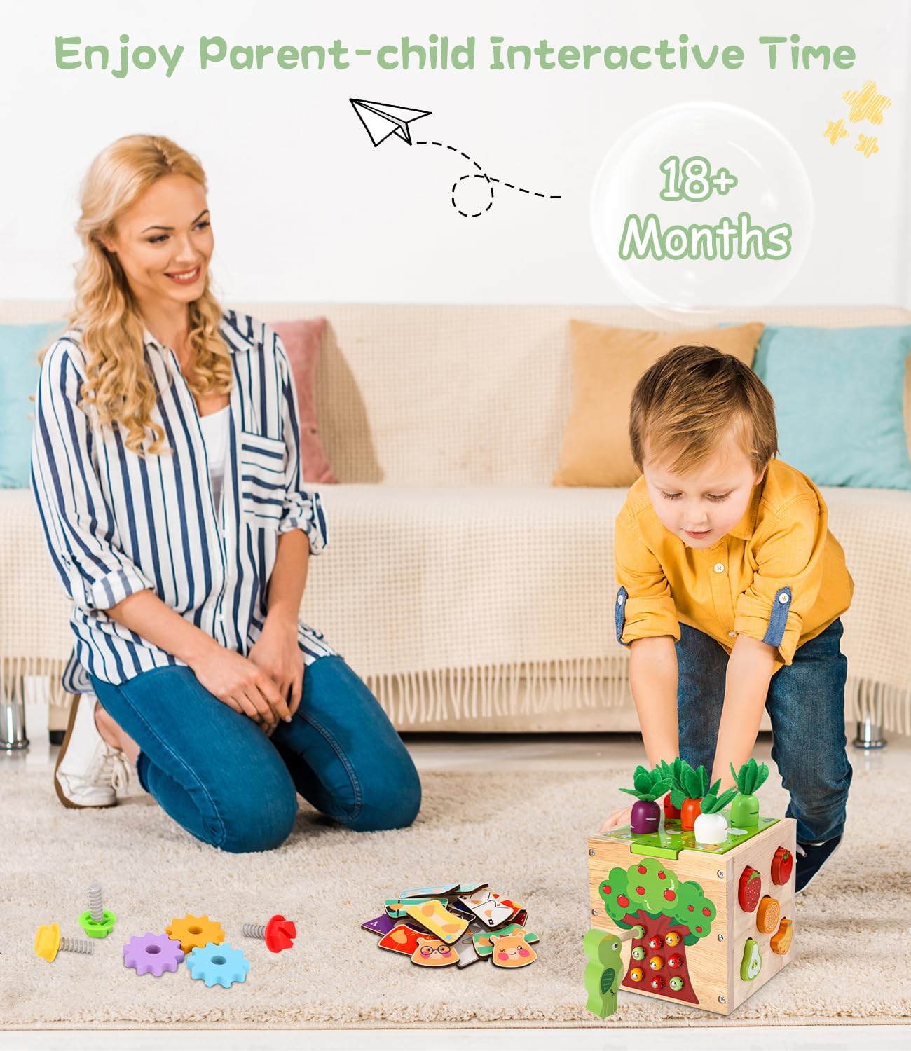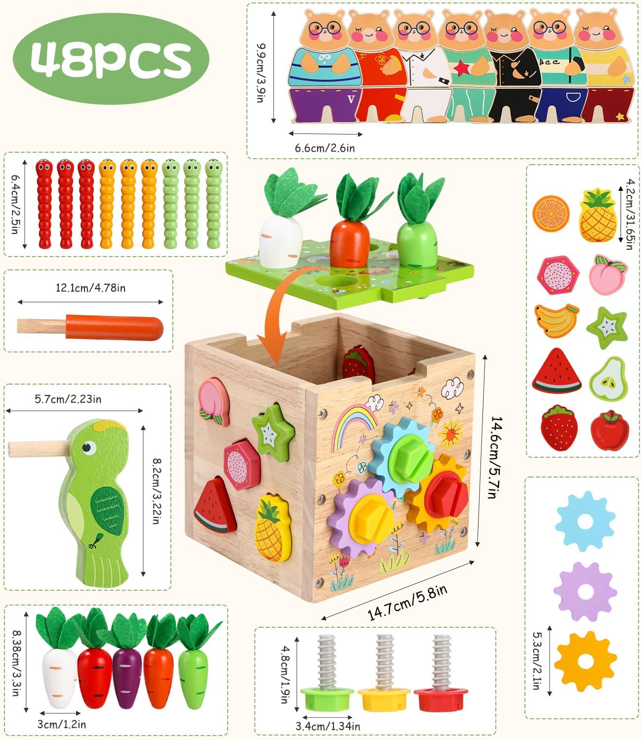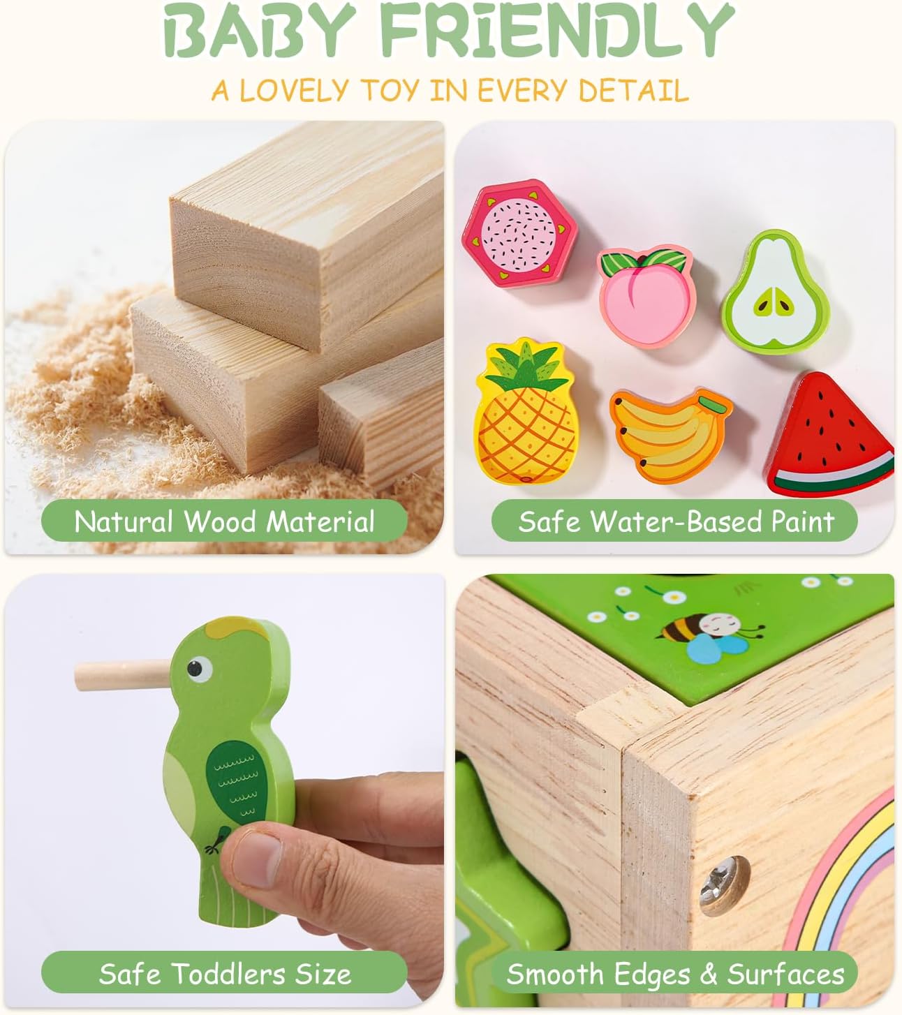 Fabriqué en bois naturel de haute qualité, ce cube d’activités garantit une durabilité exceptionnelle. Les bords sont soigneusement polis pour assurer une surface lisse, tandis que la peinture utilisée est écologique, à base d’eau, non toxique et éclatante. Ce choix écoresponsable en fait un jouet parfaitement adapté aux tout-petits âgés de 1 à 3 ans.