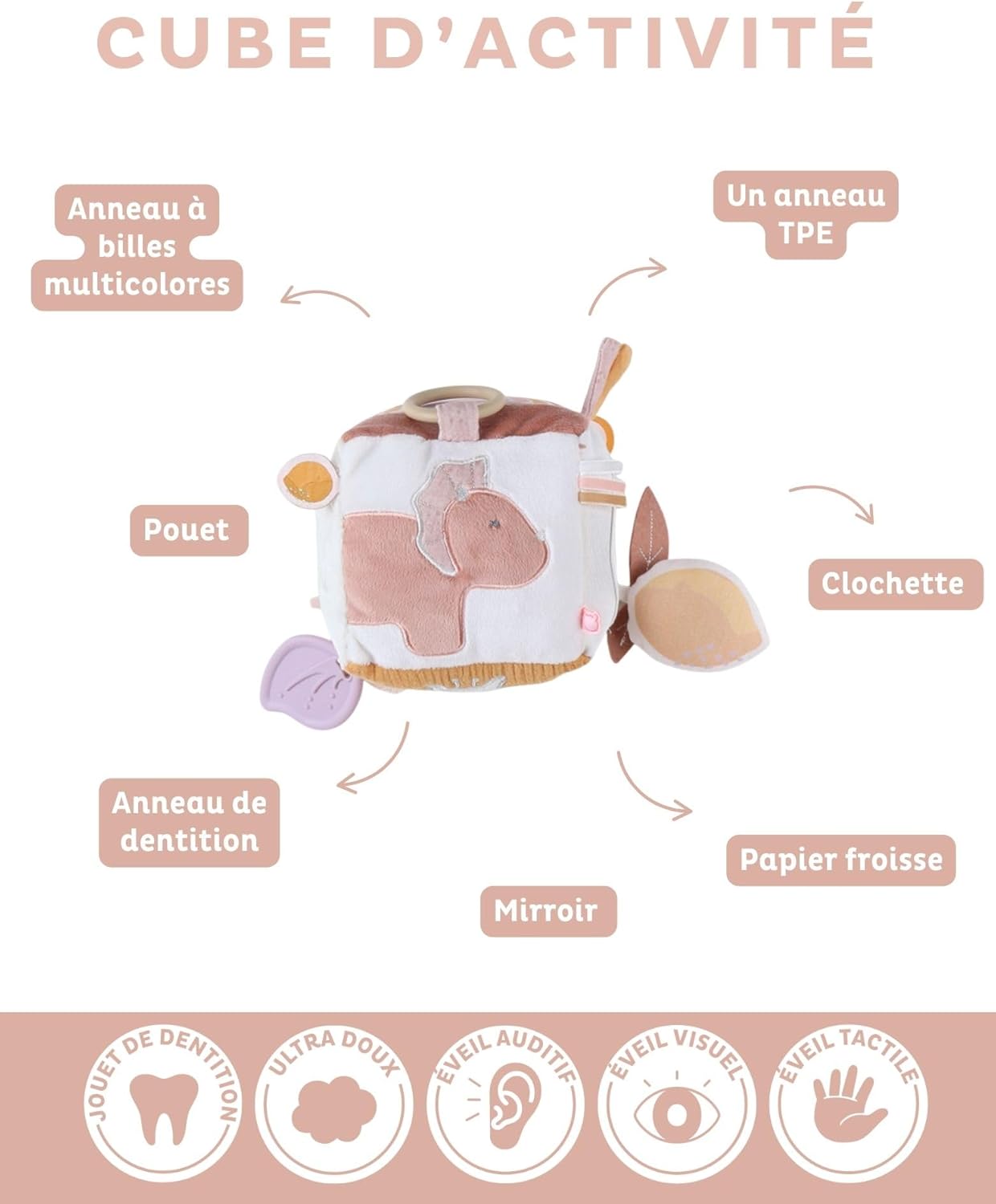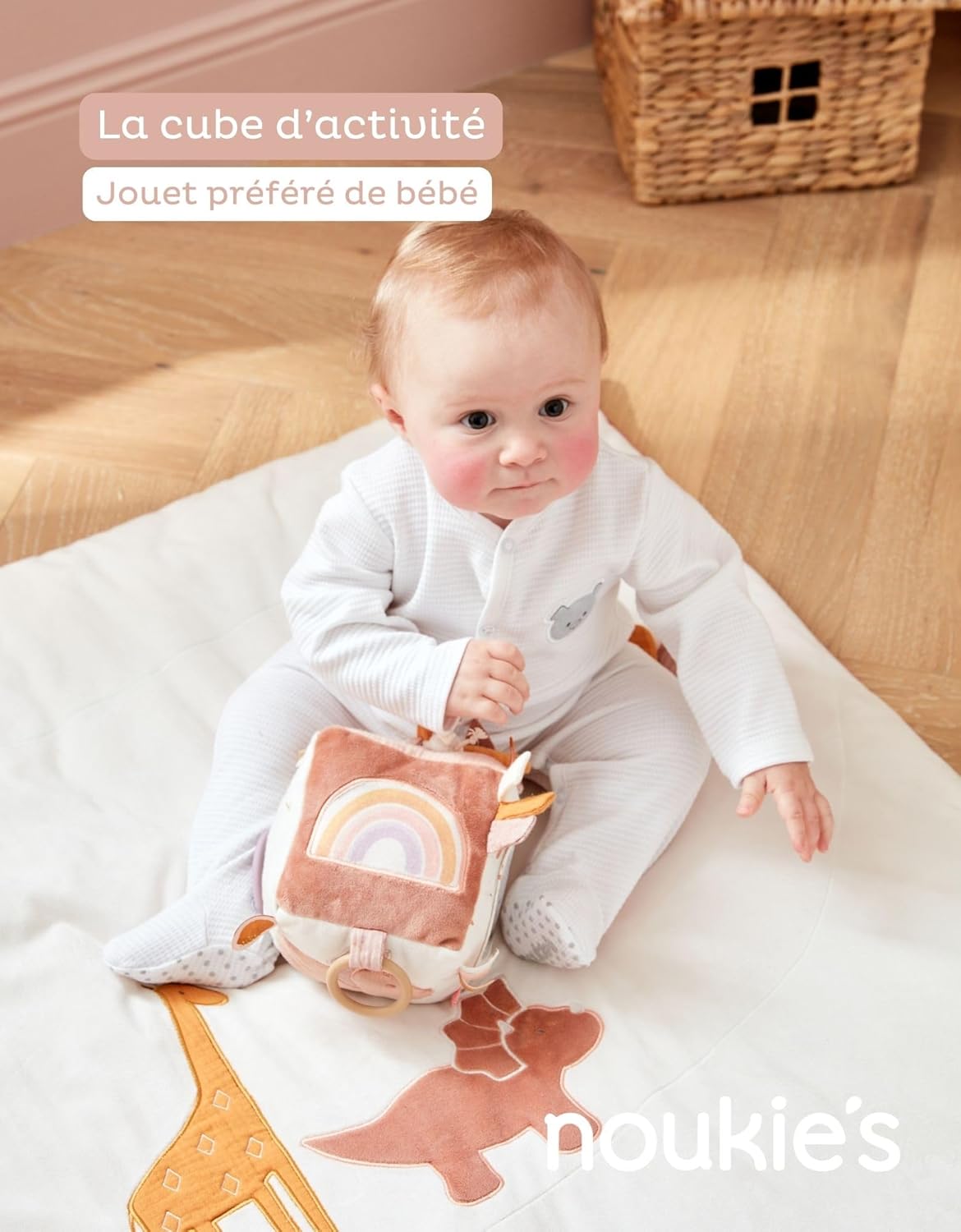 Avis Cube d’activités rose en velours pour bébé – Noukie’s