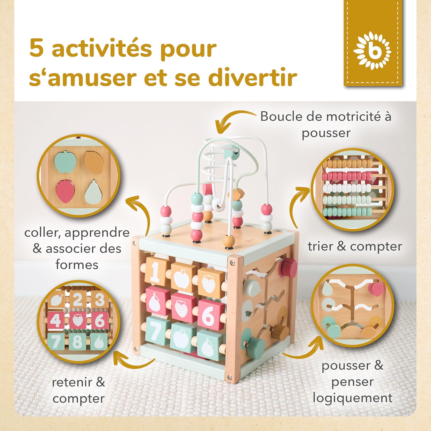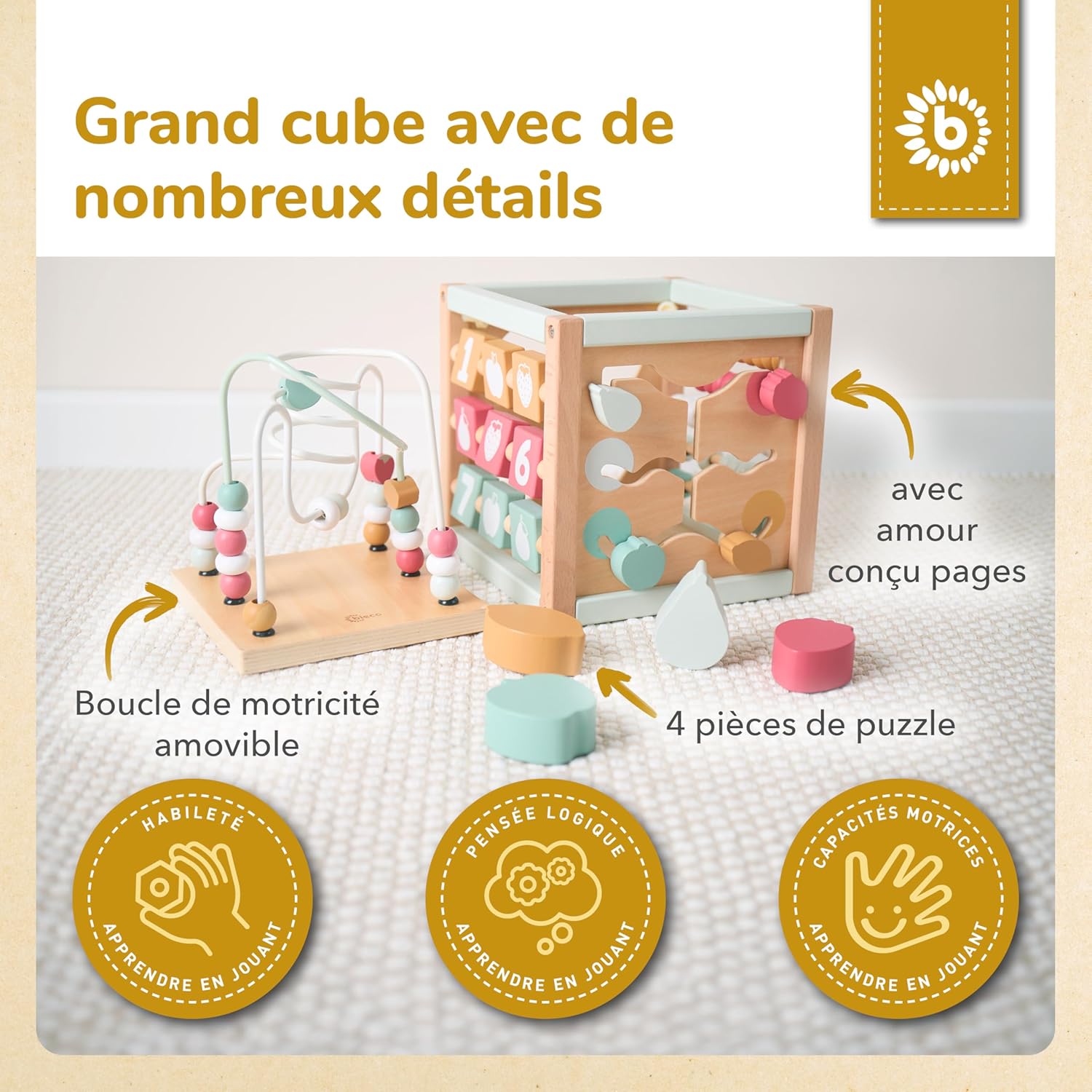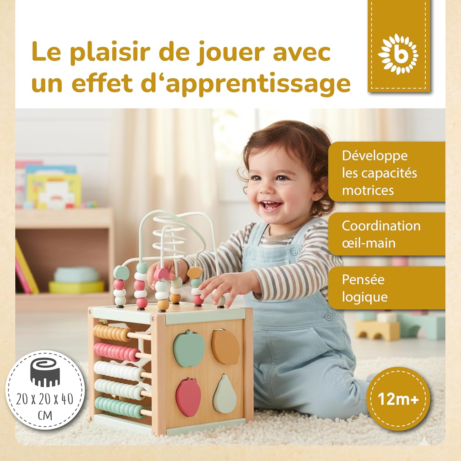 Faites découvrir à votre bébé un univers d’activités captivantes avec ce cube d’éveil en bois durable FSC®. Conçu pour stimuler la curiosité et favoriser le développement cognitif et moteur, ce jouet éducatif regorge de possibilités pour apprendre tout en s’amusant. Inspiré des principes Montessori, il accompagne votre enfant dans l’exploration de formes, couleurs et mouvements.