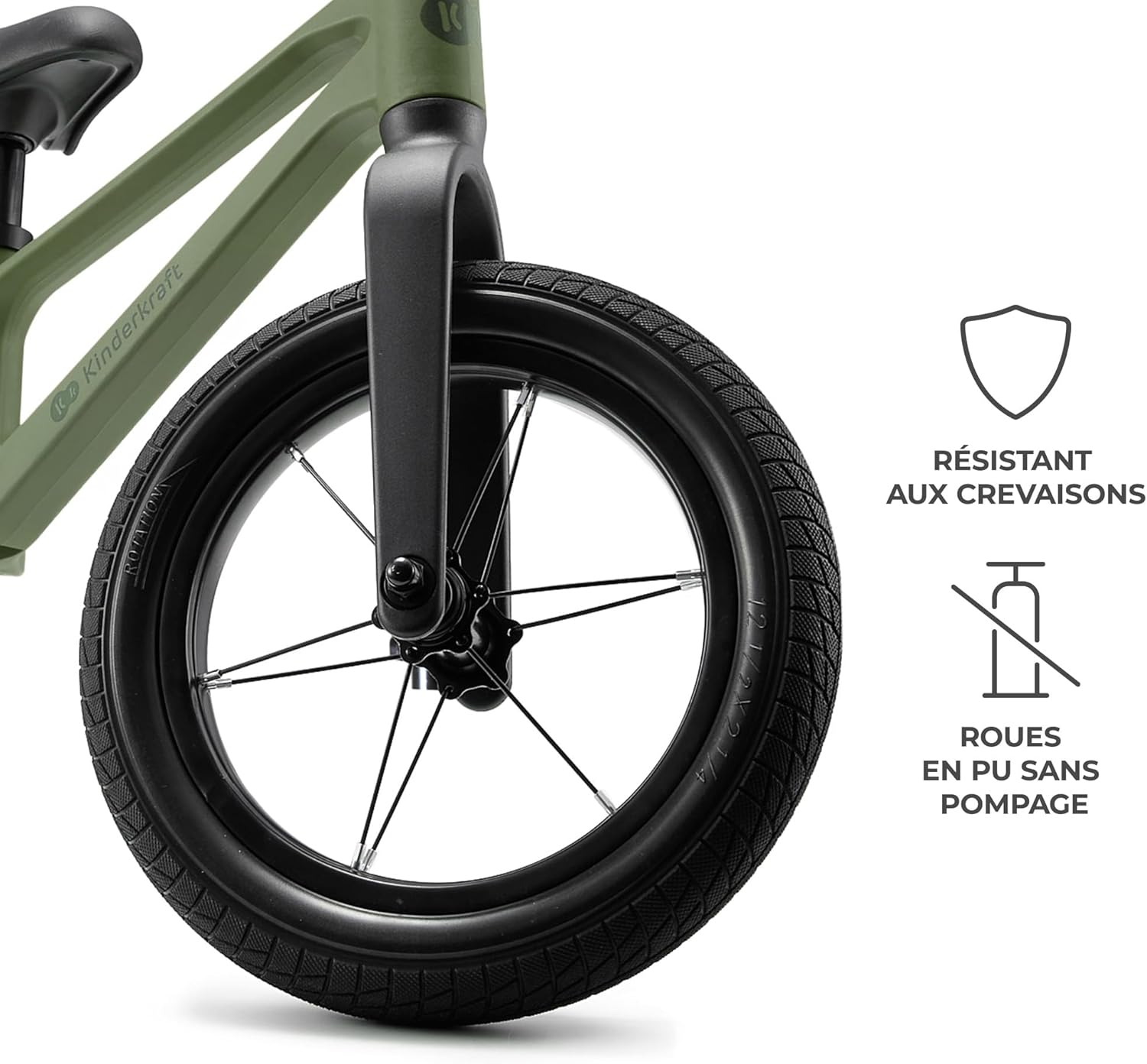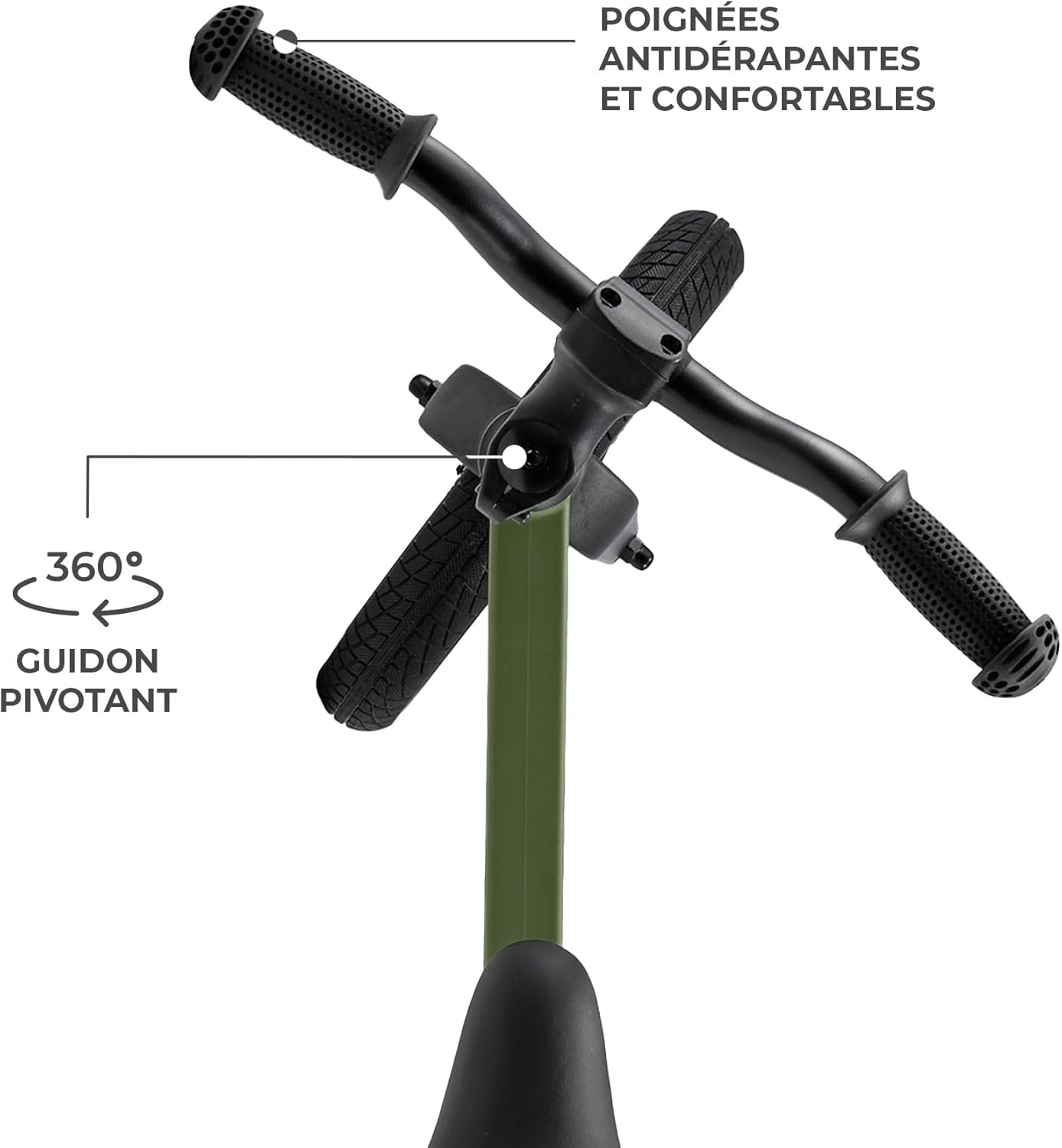 Équipée de roues en polyuréthane de 12 pouces, la draisienne garantit une conduite fluide et silencieuse sur tous types de surfaces. Ces roues sont conçues pour ne pas nécessiter d’entretien : pas besoin de les gonfler, elles restent prêtes à l’emploi en toutes circonstances. Les jantes en acier apportent une solidité supplémentaire, assurant une longévité exceptionnelle.