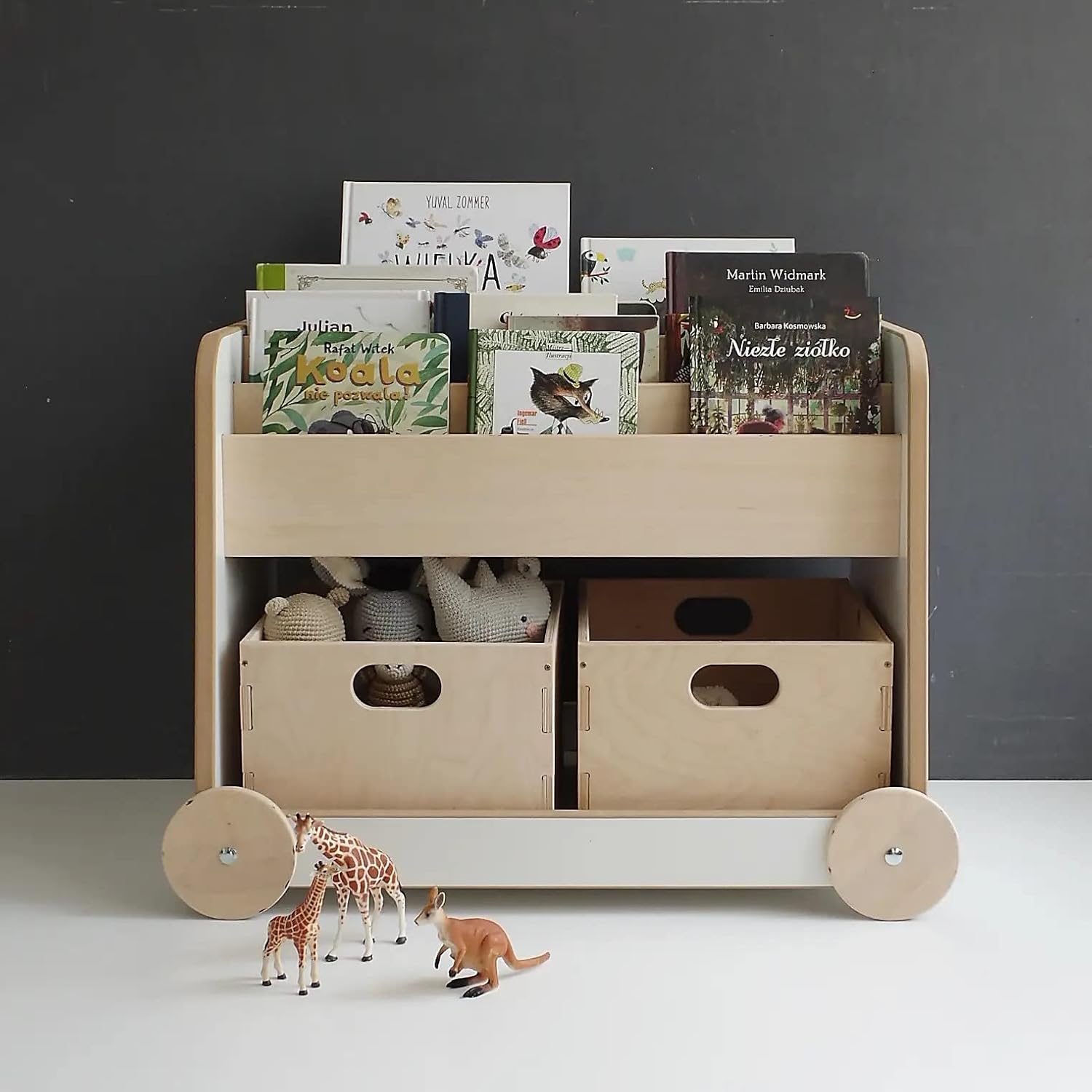 Cette étagère multifonctionnelle est pensée pour accueillir une grande variété d’objets. Livres, blocs de construction, poupées ou encore jeux de société trouveront facilement leur place sur les étagères ouvertes ou dans les deux caisses en bois amovibles. Sa conception double face permet à l’enfant d’accéder librement à ses trésors depuis n’importe quel angle, favorisant ainsi son autonomie au quotidien.