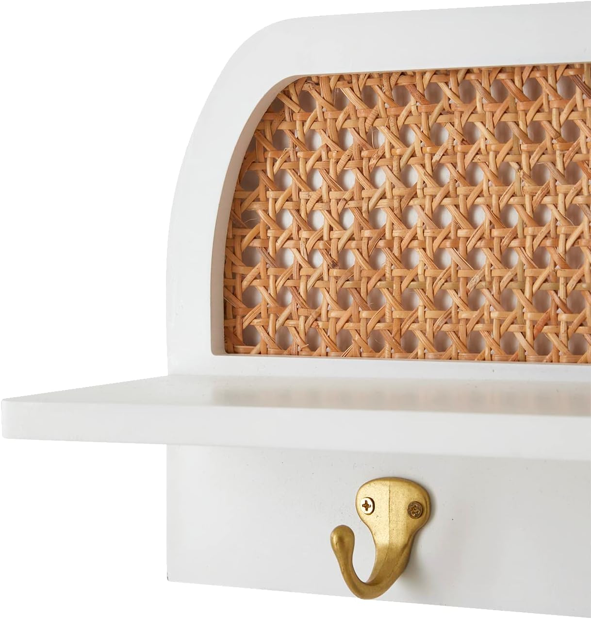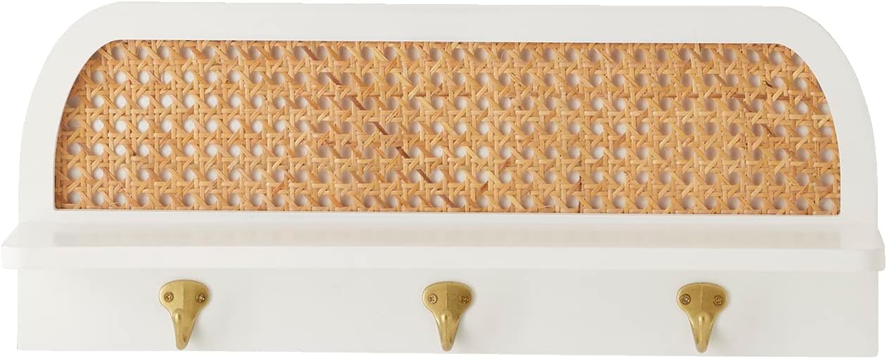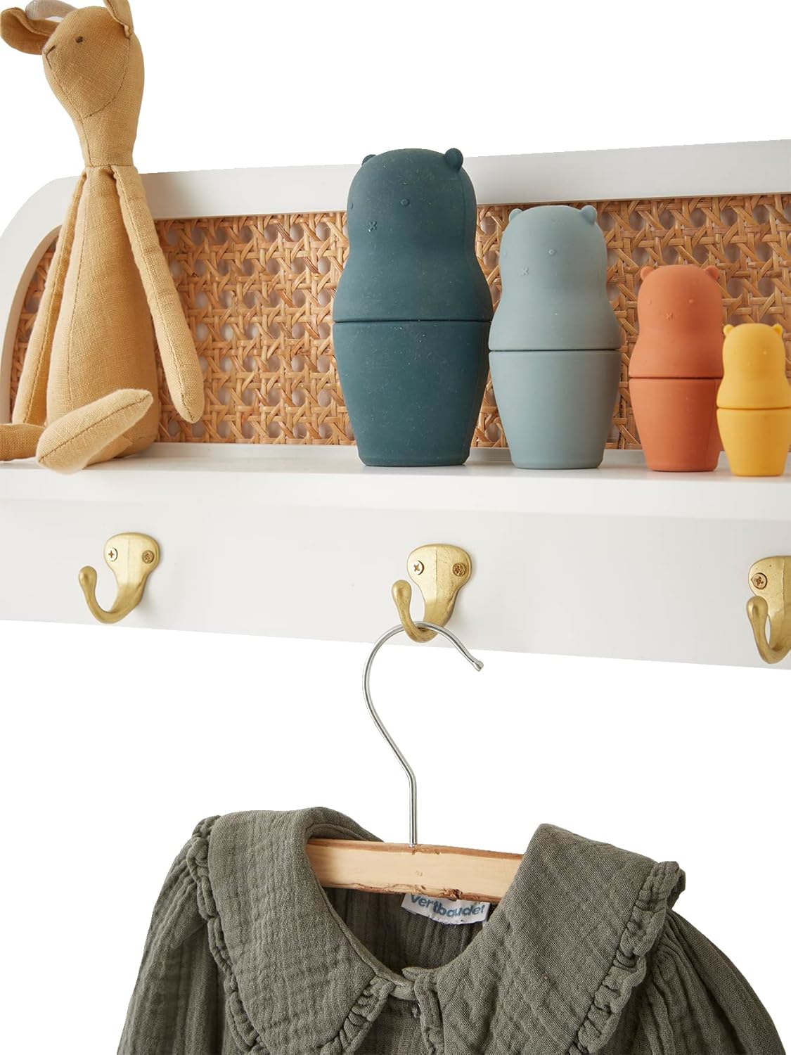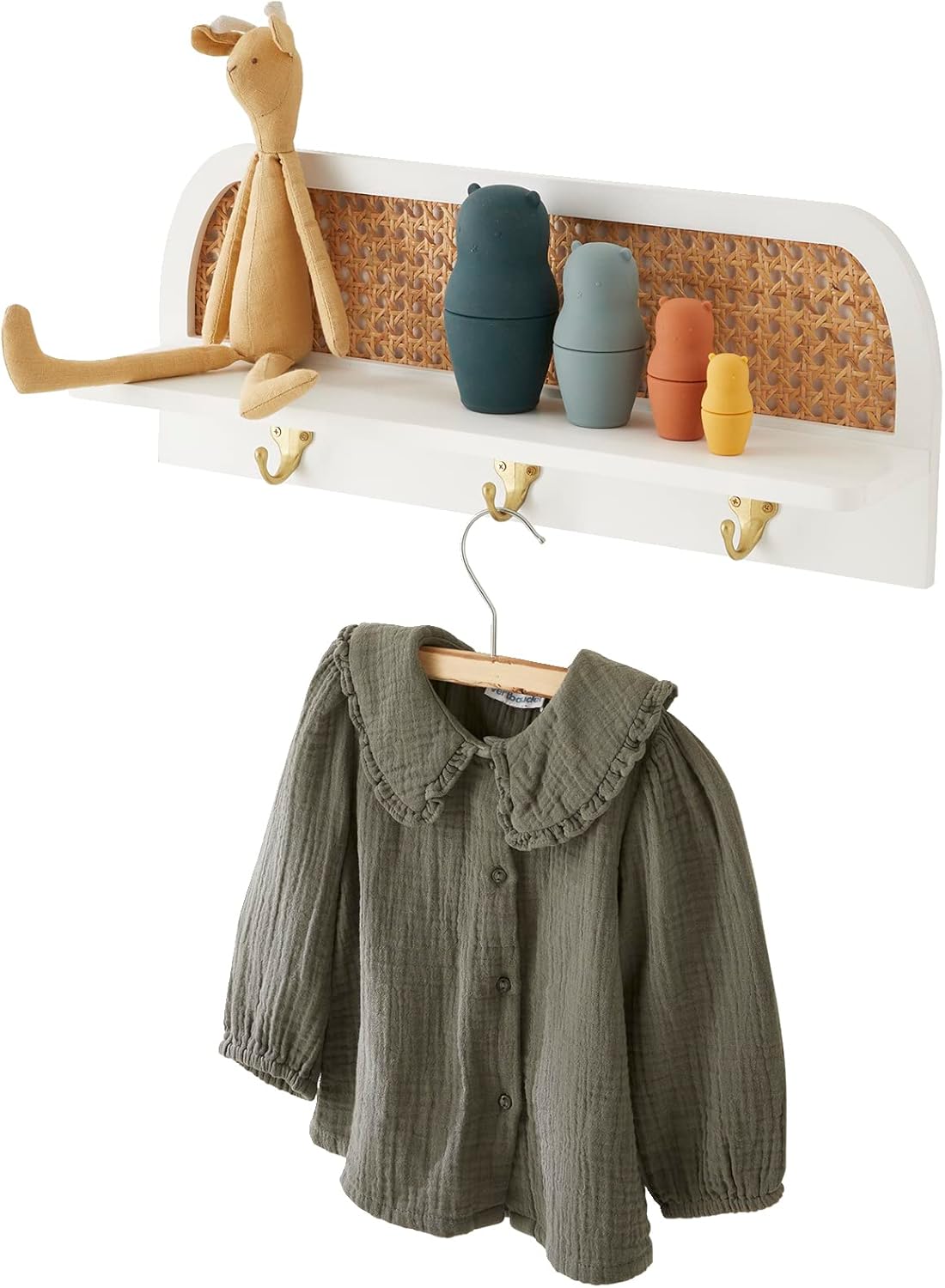 Alliez praticité et esthétique avec cette étagère porte-manteau Montessori en cannage écru, dotée de 3 patères dorées élégantes.