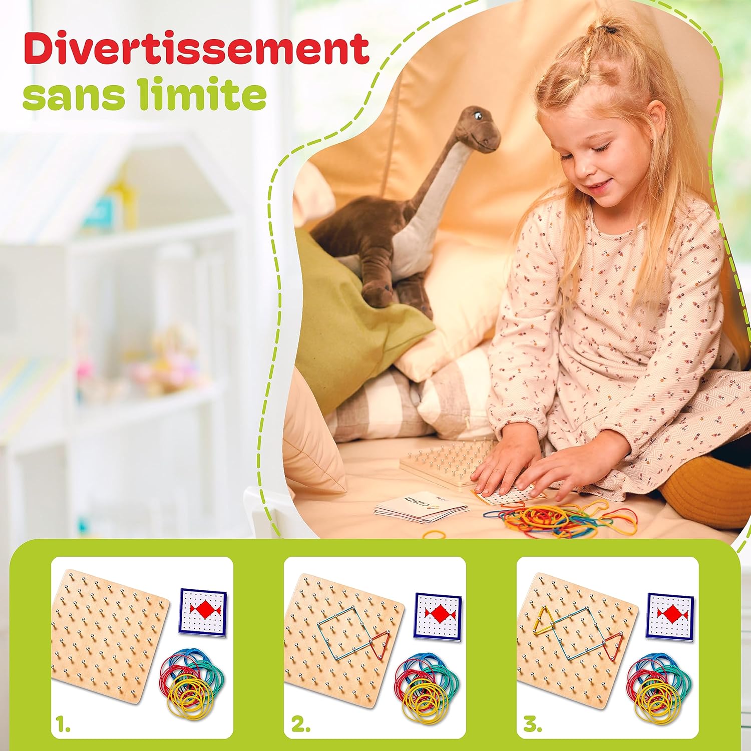 Stimulez la créativité, la logique et la motricité fine des enfants dès 5 ans avec ce géoplan en bois 8×8, livré avec cartes-guides, fiches à colorier et élastiques colorés.