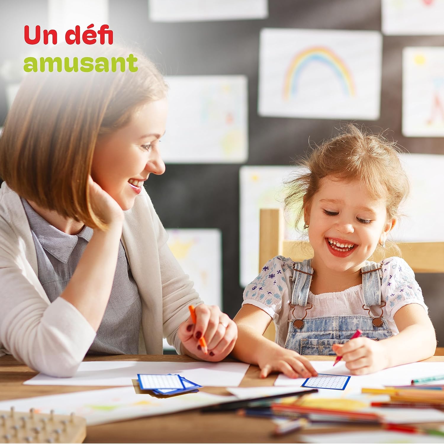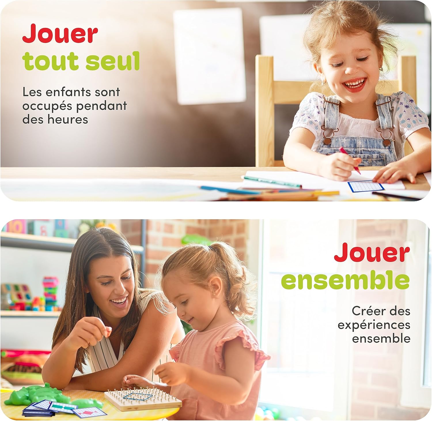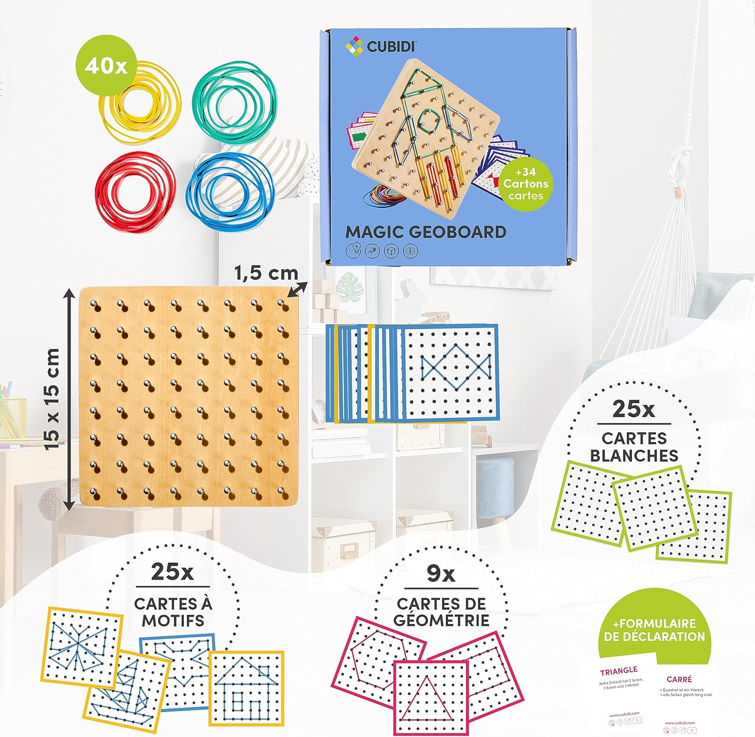 Avec ses 34 modèles inclus, ce géoplan offre une variété infinie d’activités. Les cartes-guides permettent aux enfants de suivre des modèles tout en renforçant leur capacité d’observation, tandis que les fiches blanches à colorier invitent à laisser libre cours à leur imagination. Que ce soit en activité libre ou guidée, seul·e ou en groupe, ce jeu s’adapte à toutes les envies et tous les environnements : à la maison, à l’école ou même lors de déplacements.