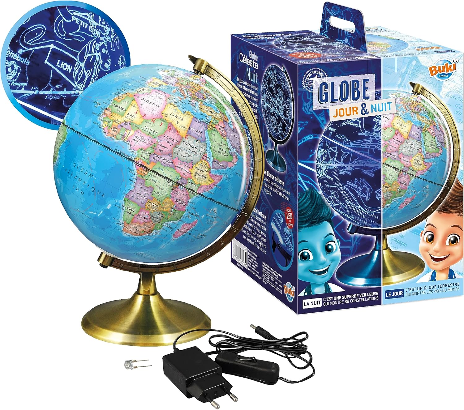 Découvrez le globe éducatif jour et nuit, un outil interactif de 21 cm alliant apprentissage géographique le jour et exploration des 88 constellations majeures la nuit, idéal pour les curieux dès 8 ans.